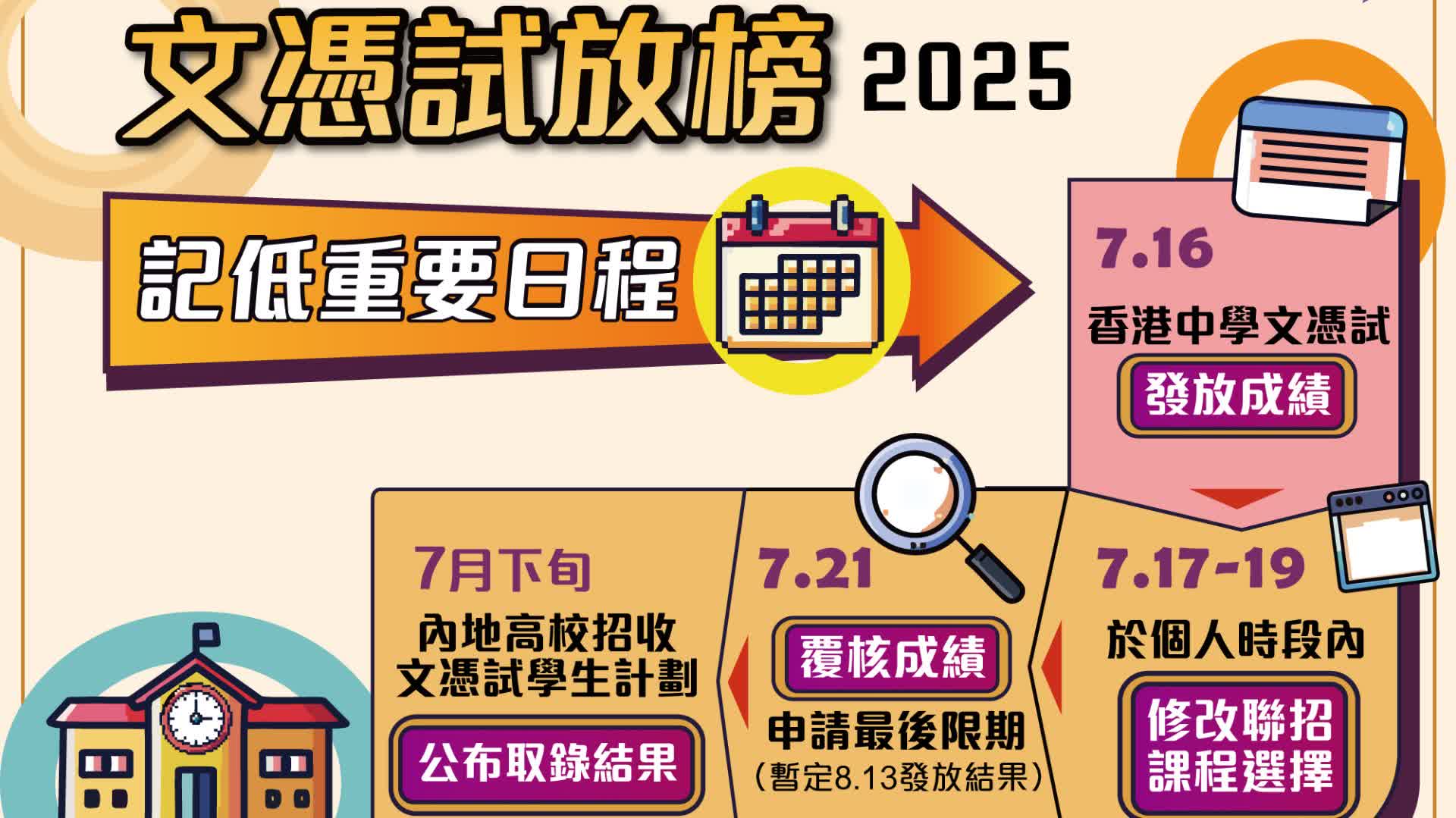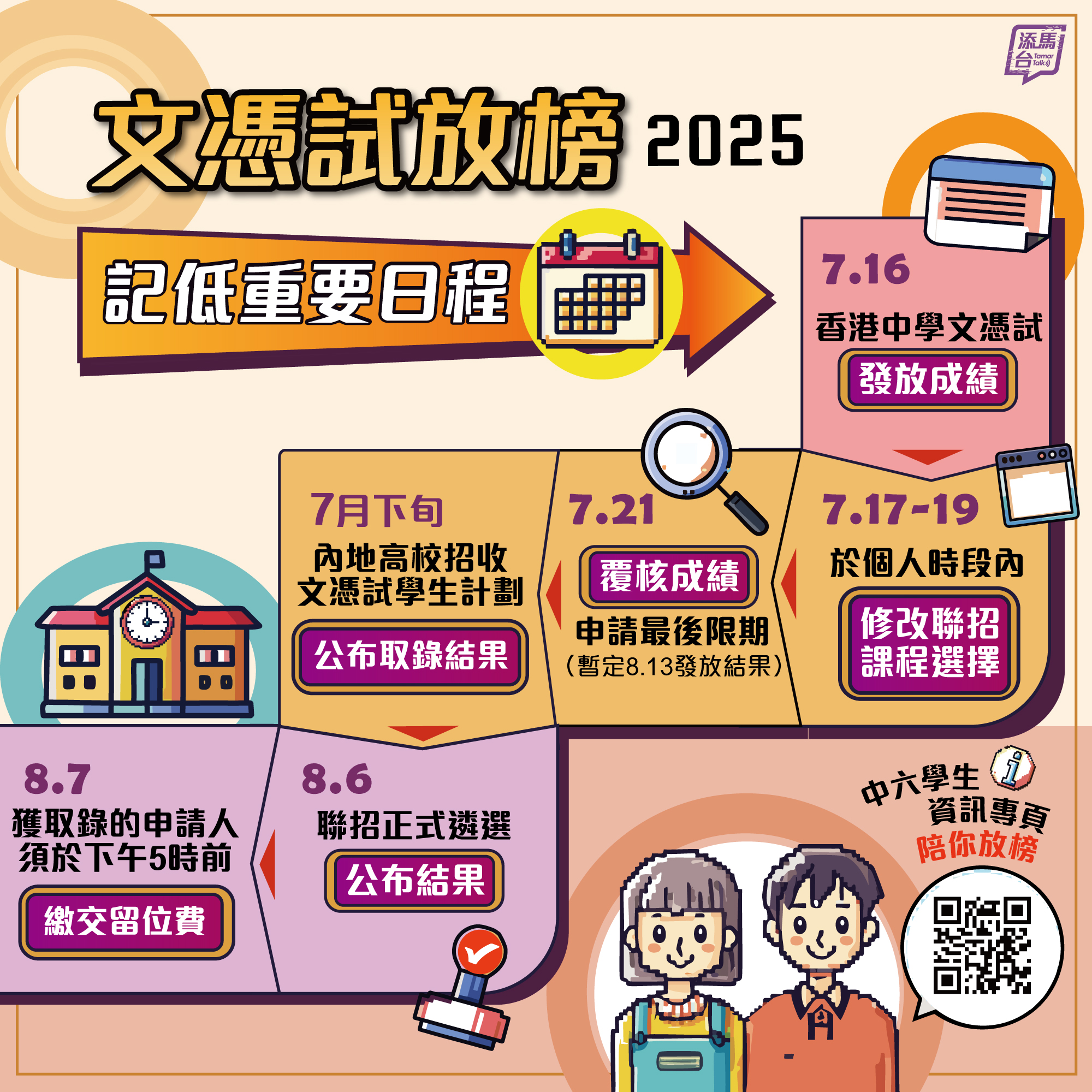 大公文匯全媒體報道,2025香港中學文憑試即將於本周三(7月16日)發放成績。考評局提醒,除了要記低放榜日外,還要留意修改Jupas選擇、申請覆核成績等重要日子!大公文匯全媒體整理DSE放榜日後重要日程,希望考生們以放鬆心情迎接考試結果!