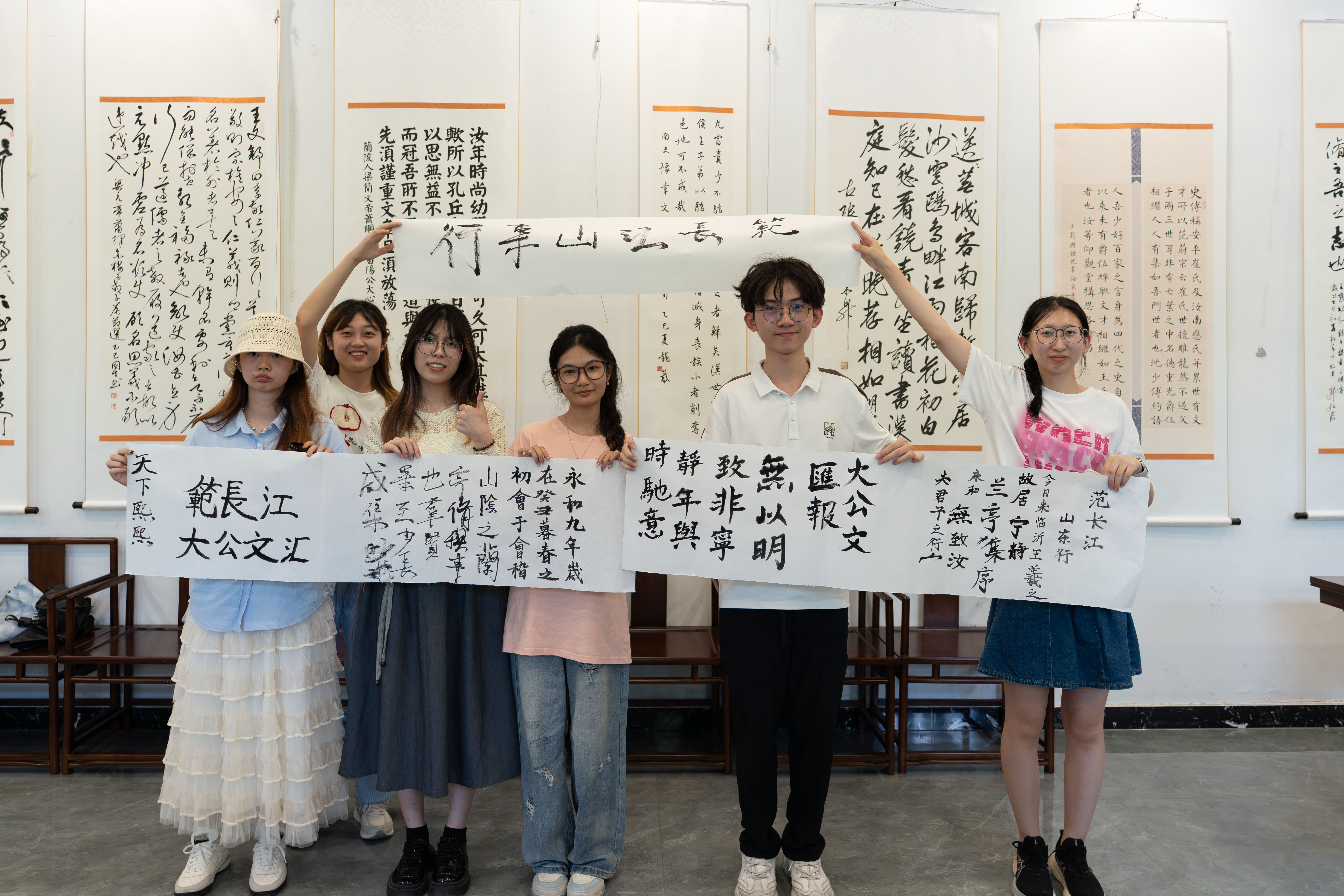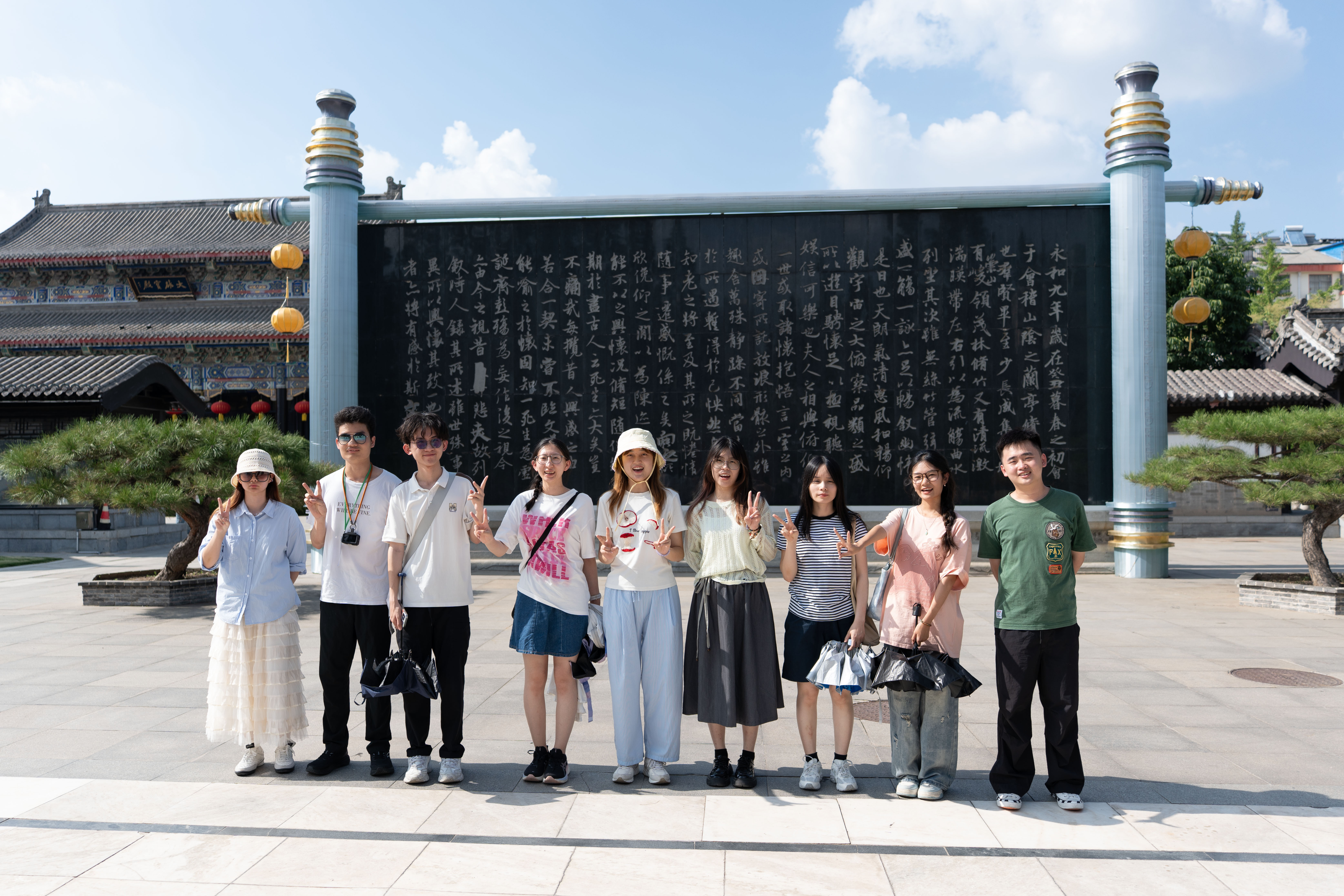12日下午,香港傳媒學子來到王羲之故居。在這座古典園林式建築群內,學子們走過洗硯池邊,欣賞山東歷代書法名家的作品牆,又來到書法體驗區親身體驗。來自香港樹仁大學的馮一笑第一次體驗軟筆書法:「看似簡單的筆畫蘊藏着很多講究。站在這裏寫字,好像離王羲之的世界近了些。」