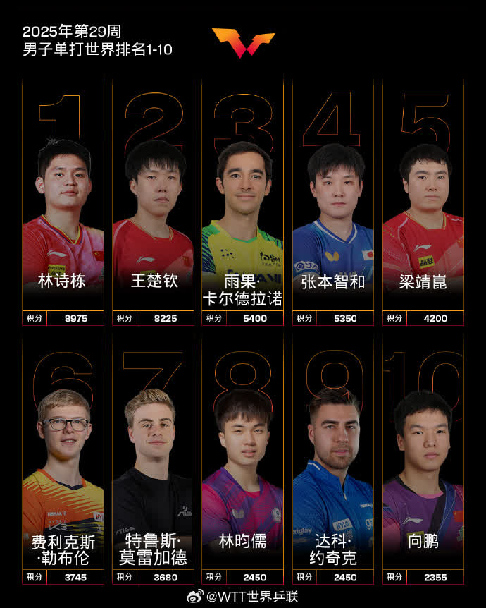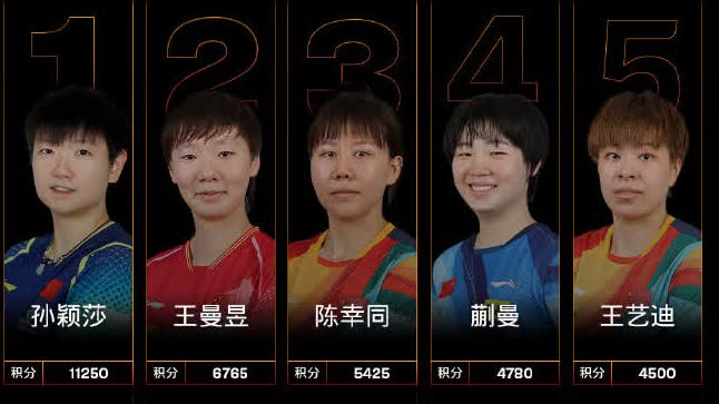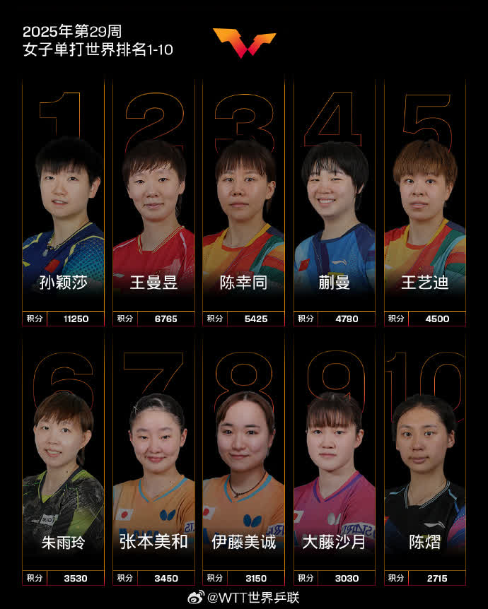 大公文匯網報道,7月15日,世界乒聯公布2025年第29周排名。女單方面,孫穎莎11250分保持第一,王曼昱6765分第二, 陳幸同5425分第三,朱雨玲3530分第六,較上周上升8位,陳熠2715分排名第十,較上周上升7位。男單方面,林詩棟8975分保持排名第一,王楚欽8225分排名第二,雨果5400分排名第三。