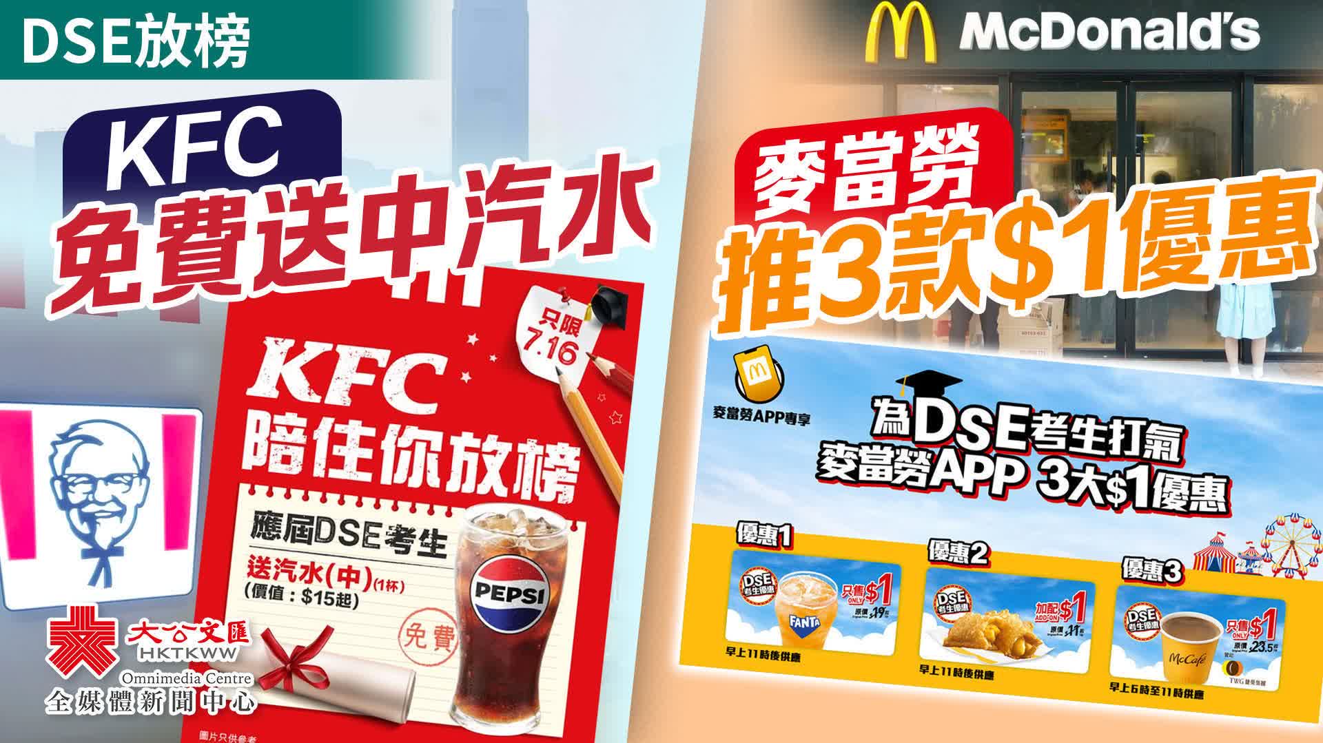 大公文匯全媒體報道,明日(16日)就是DSE中學文憑試放榜的大日子,KFC及麥當勞均推出優惠,為考生打氣。