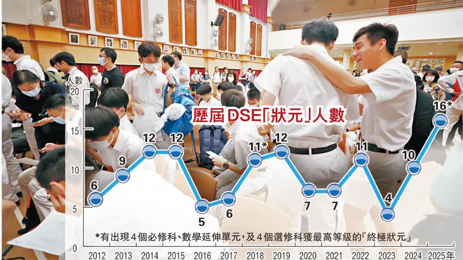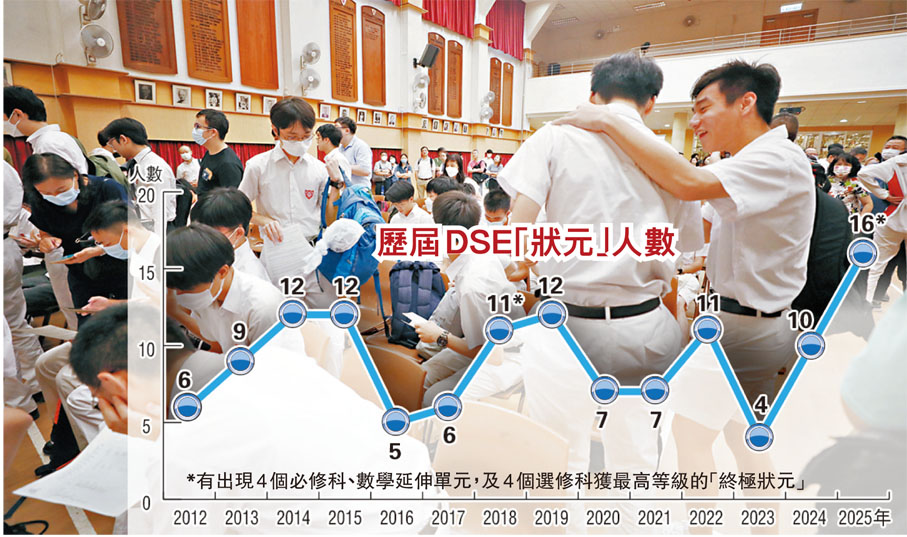 (香港文匯報 記者 姜嘉軒)香港中學文憑試(DSE)今日放榜,考評局昨日率先公布今屆考生整體情況。考評局秘書長魏向東表示,今年共誕生16名「狀元」,為文憑試歷屆最多。他們分別為11男5女,來自14所學校。其中一名男生考獲7科5**、公民科達標,並在數學延伸部分同樣取得5**,為歷來第二次出現8科加數學延伸單元均為最高等級的「終極狀元」,另有十名「超級狀元」。此外,今屆共有17,662名考生考獲「332A33」基本升讀大學門檻,以1.3萬個大學聯招(JUPAS)資助學額計,平均約1.35人爭一位。考評局強調,每年考卷均維持固定的難度水平,狀元人數多寡只視乎考生該年的發揮,估計今年「狀元」人數增加,或與優化核心科目後,學生有更多時間修讀選修科目及數學延伸部分有關。