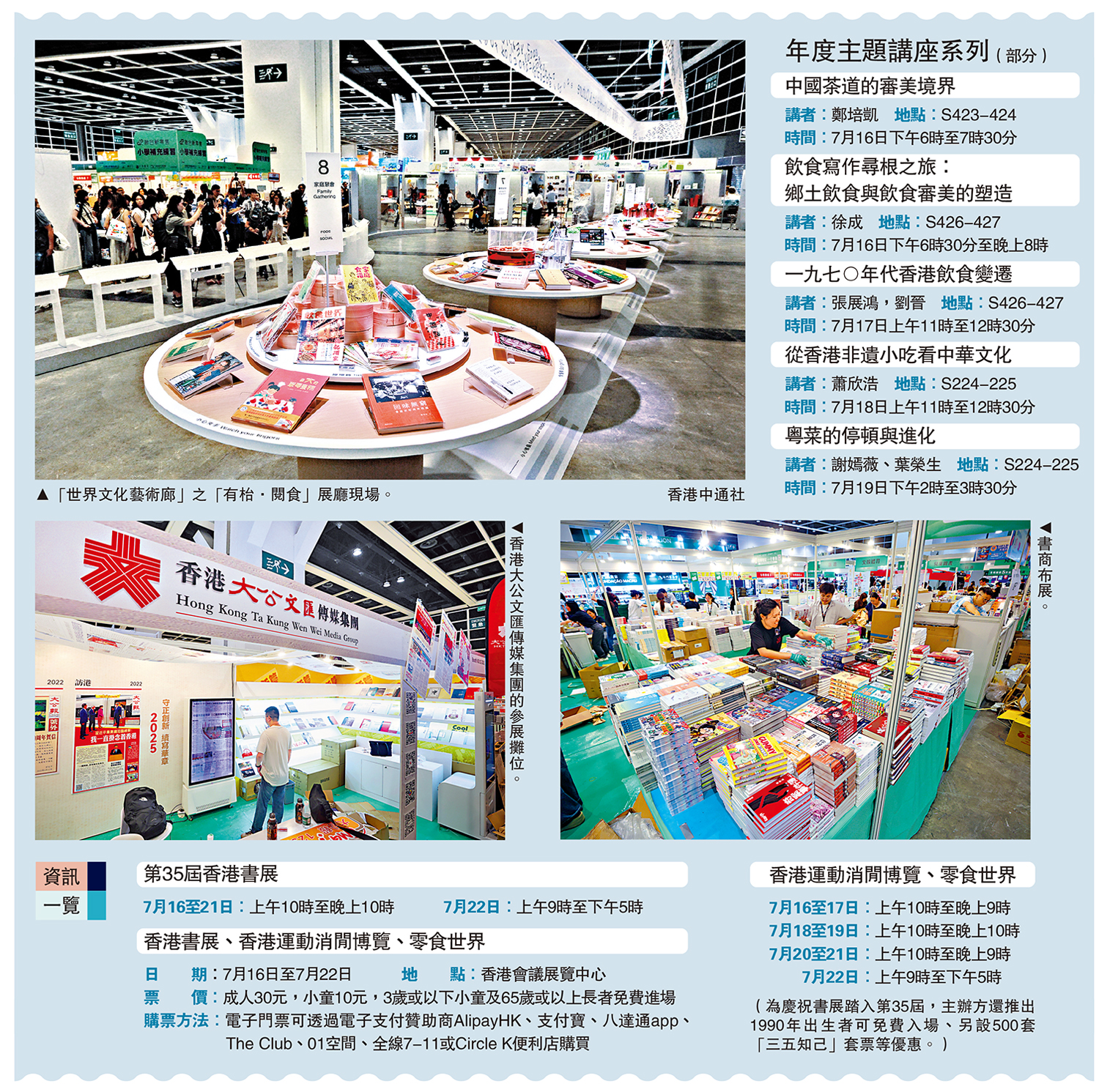 (大公報 記者 劉 毅)由香港貿易發展局主辦的第35屆香港書展,將於今日至7月22日在香港會議展覽中心舉行。本屆書展以「飲食文化·未來生活」為年度主題,場內外將舉辦超過620項精彩文化活動,連帶香港運動消閒博覽及零食世界,一共吸引770間參展商參與,主辦方預計有過百萬人入場。