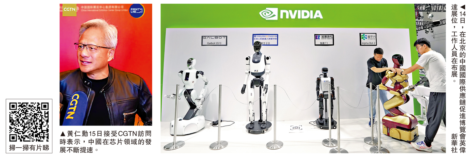 15日上午,黃仁勳到中國貿促會拜會了會長任鴻斌。他在會談中表示,人工智能等技術將進一步為供應鏈服務,促進供應鏈穩定暢通。他還提到,中國市場的規模和技術整合能力為全球企業提供關鍵支持。