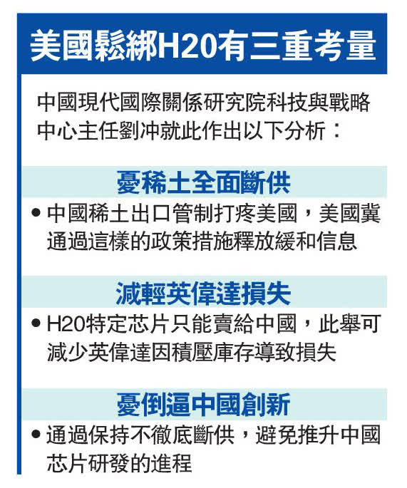 據報道,今年4月,美國政府決定禁止英偉達向中國市場銷售其H20芯片。有關禁令迫使英偉達面對高達150億美元的巨額損失。針對英偉達將向中國市場銷售H20芯片,外交部發言人林劍15日回應說:「我們一般不對企業行為作出具體的評論。我要指出的是,中方反對將科技和經貿問題政治化、工具化、武器化,對中國進行惡意封鎖和打壓的立場是一貫的、明確的。」林劍說,這種做法擾亂全球產供鏈的穩定,也不符合任何一方的利益。