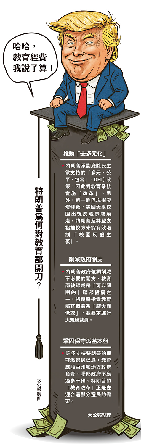 教育議題已成為美國兩黨所謂「文化戰」的前線。特朗普推動「教育改革」的主要目的包括廢除民主黨支持的「多元、公平、包容」(DEI)政策,通過解散教育部、將教育管理權歸還各州來迎合保守派選民,以及兌現削減政府開支的承諾。哈佛大學等被視為自由派大本營的名校近期成為特朗普重點打擊對象。哈佛大學14日發布信函稱,特朗普政府採取的凍結經費、阻撓國際學生入學、對捐贈基金增稅等措施,可能導致該校每年收入銳減近10億美元。