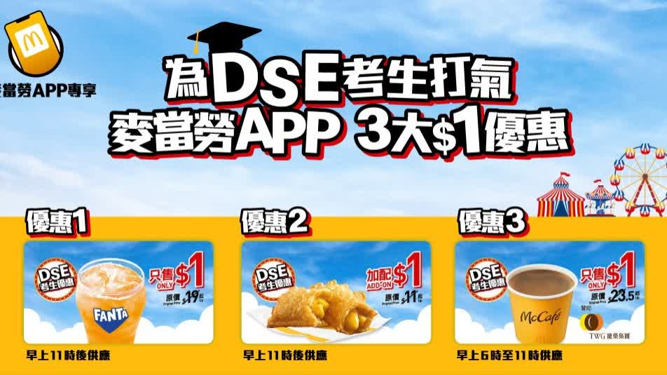 大公文匯全媒體報道,2025香港中學文憑試今日(7月16日)發放成績,全港多間商戶推出特別優惠為考生打氣,包括麥當勞1蚊大芬達/蘋果批/McCafé即磨黑咖啡、百佳&屈臣氏送運動飲品、7-Eleven送咖啡+泡芙、糖水半價、牛気放題套餐8折等,願考生們輕鬆迎接DSE結果!另外,香港建造學院亦宣布,今日,全港市民可免費乘坐途經香港建造學院九龍灣院校的九巴16號線。