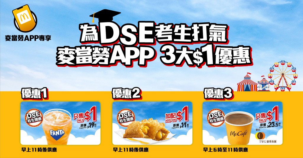 為替眾考生打氣,麥當勞推出3大1蚊優惠。由7月14日至18日,麥當勞將推出1蚊大芬達、1蚊McCafé即磨黑咖啡及購買任何超級套餐可以1蚊加購蘋果批!