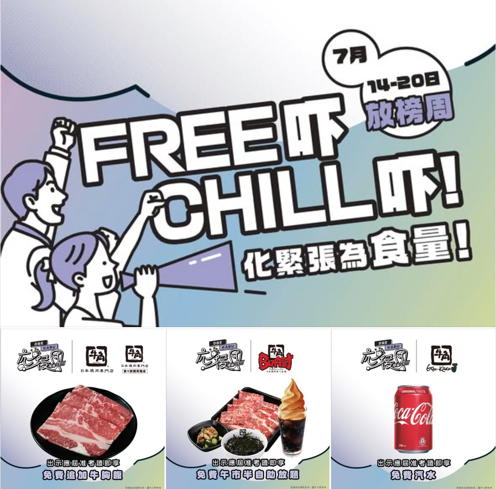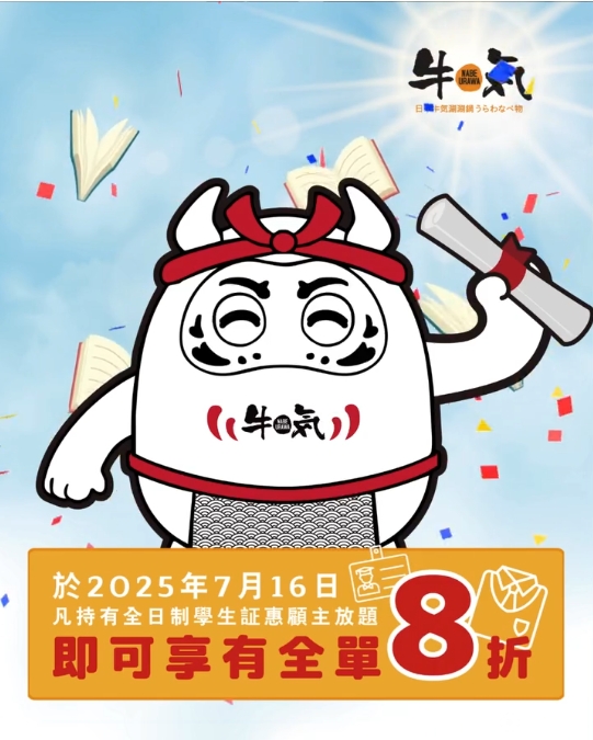 日式火鍋放題「牛気」推出DSE放榜日推出限定優惠,於2025年7月16日當天,任何學生只要穿着校服或出示有效學生證,並讚好或追蹤「牛気」的Facebook專頁或Instagram賬號,再於當日指定帖文留言鼓勵考生的說話,即可惠顧任何90分鐘或120分鐘主放題套餐時尊享「8折」優惠!