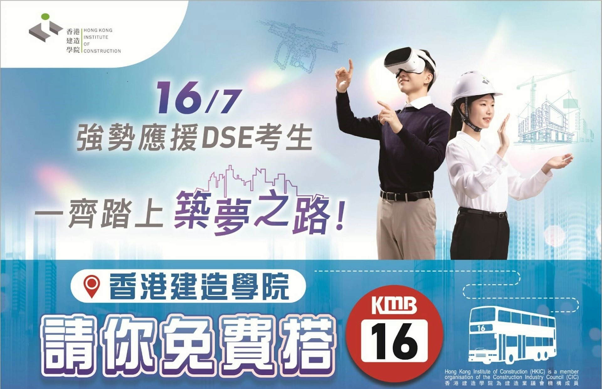 香港建造學院宣布,7月16日DSE放榜日舉辦免費乘坐九巴16號線活動,屆時全港市民可以免費乘坐途經香港建造學院九龍灣院校的九巴16號線。