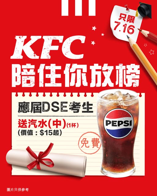 應屆DSE考生只要於放榜日於KFC分店收銀處出示2025年DSE成績通知書或成績通知短訊,再Like KFC(HK) Facebook或IG或Threads,KFC即刻送中汽水一杯。KFC還會快閃何文田,聯同Hi Five成員在學校附近派發「芝心火腿脆卷」,率先派「卷」與各位考生打打氣。
