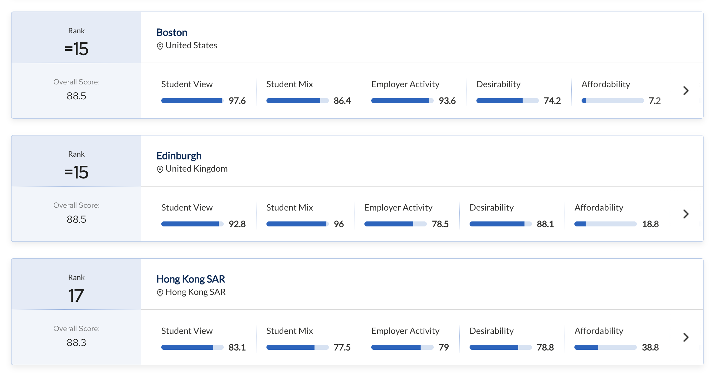 本年度排名覆蓋全球150個主要留學目的地,依據大學排名、學生多樣性、城市吸引力、僱主活躍度、生活成本負擔能力及學生評價共6項核心指標進行綜合評估。香港以88.3分的綜合得分,在亞洲地區位居第7位。