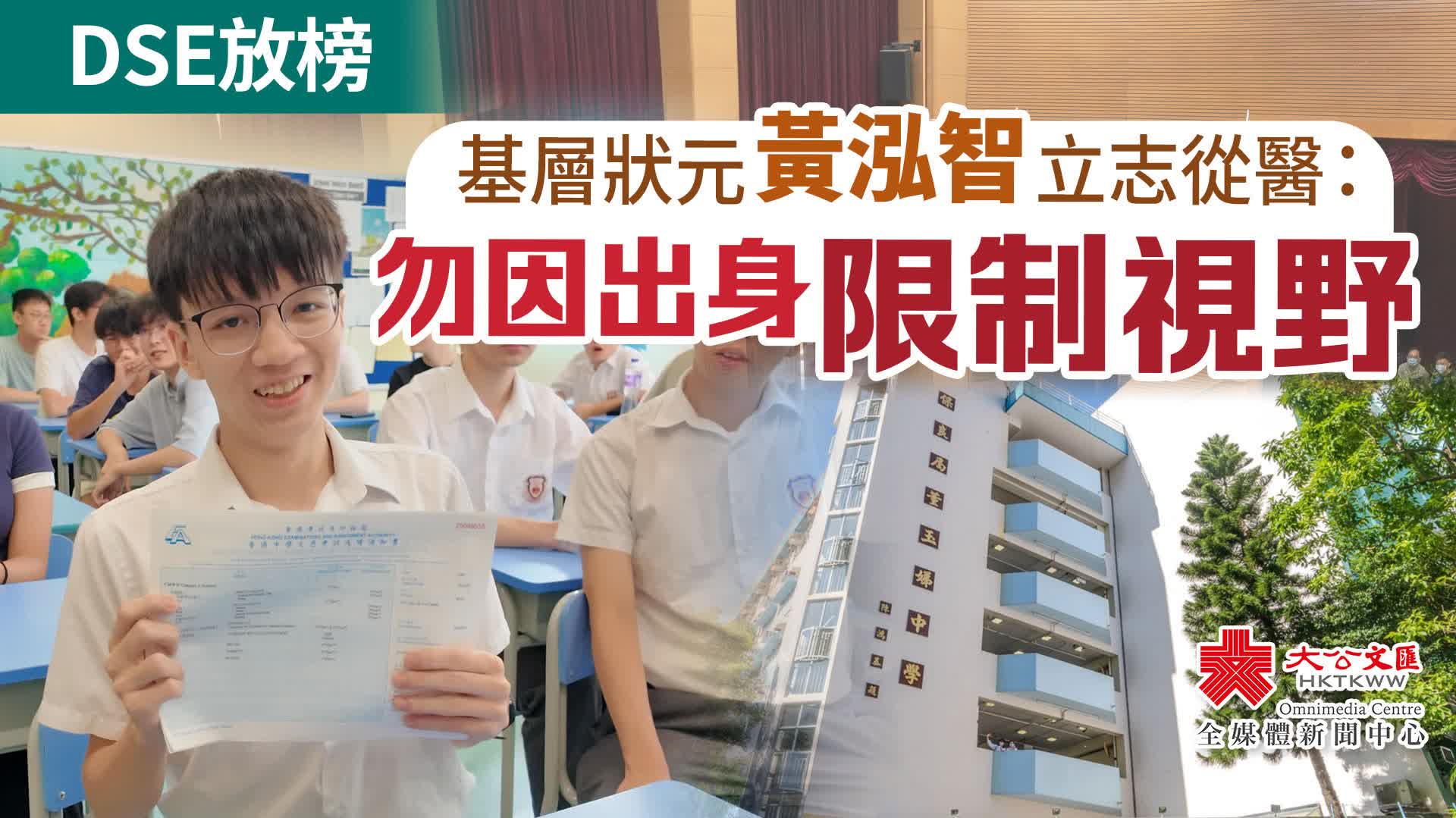 大公文匯全媒體報道,中學文憑試(DSE)今日(16日)放榜,屯門區保良局董玉娣中學迎來喜訊,學生黃泓智考獲「超級狀元」。黃泓智心水香港中文大學醫學院,出身基層的他又以自身經歷勉勵其他學子:「勿因出身限制視野」。