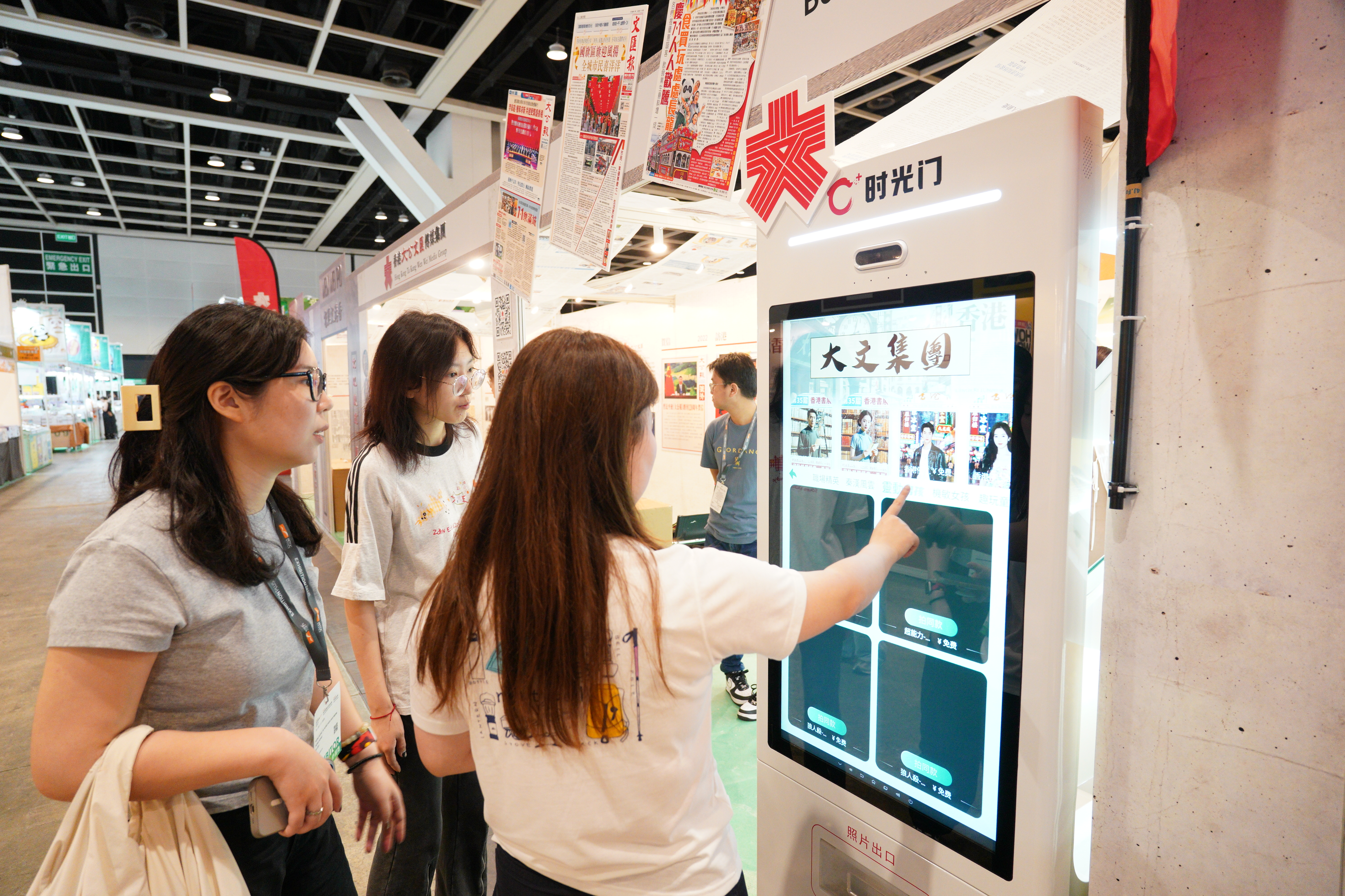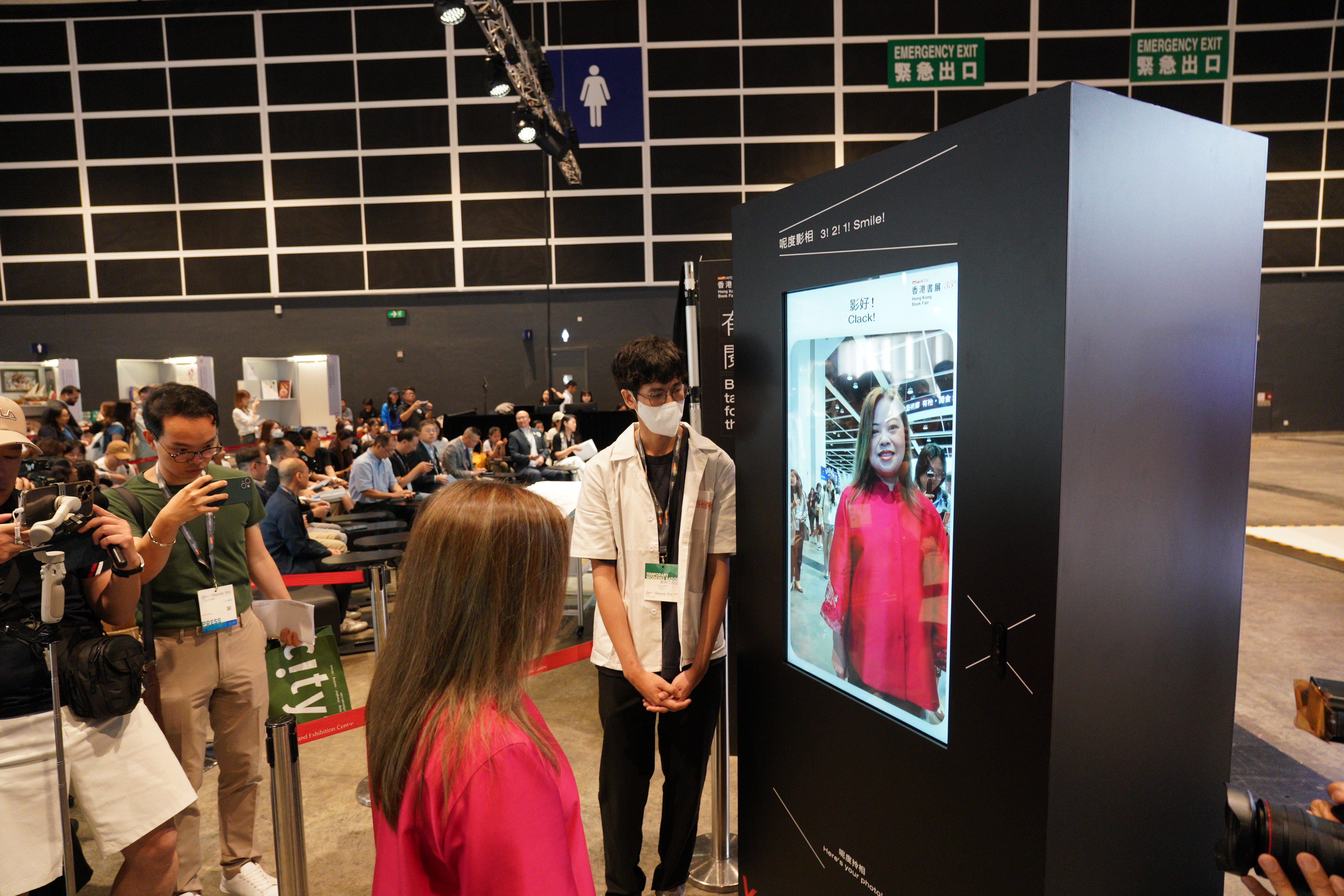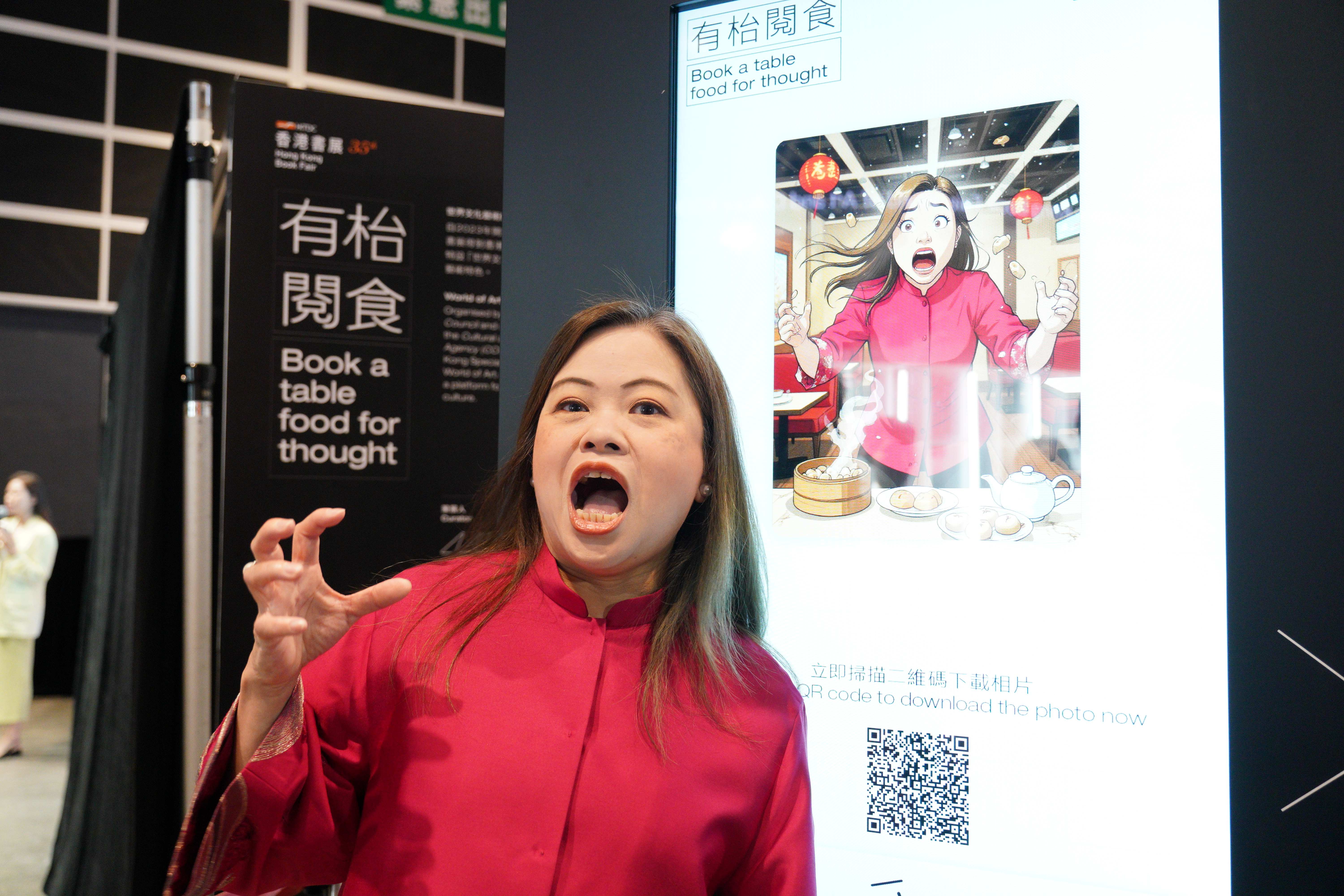 文化體育及旅遊局局長羅淑佩亦有到場,她與「呢度book位」裝置互動,又在參觀一個攤位時試玩AI攝影機。羅淑佩選擇了「美食家」作背景,以AI生成一幅漫畫,十分趣緻。