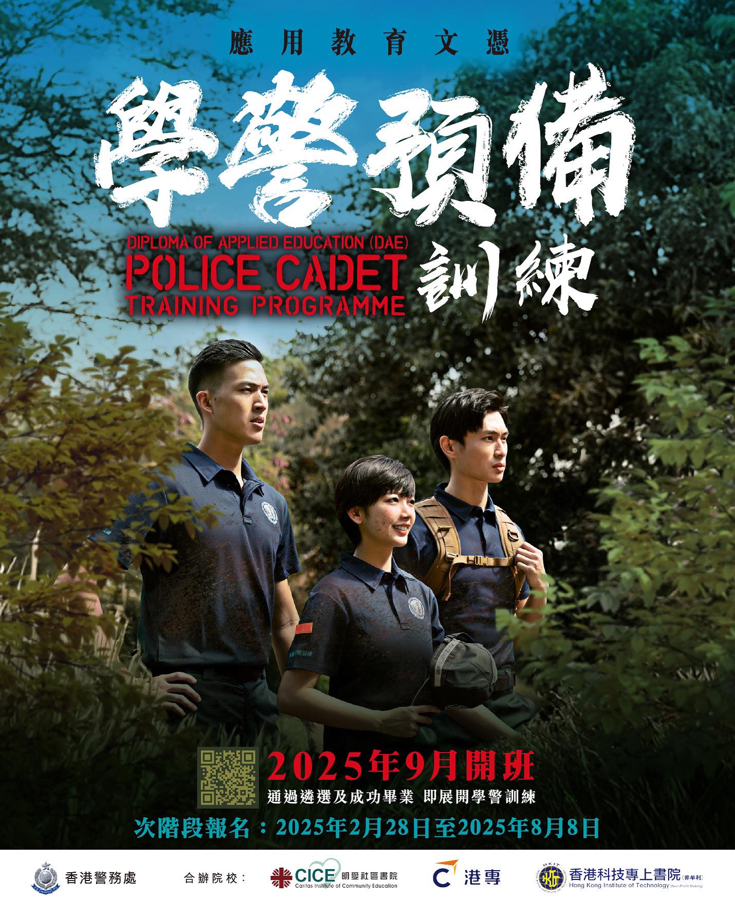 警隊由2024/25學年 (即2024年9月) 起與3間專上院校,包括明愛社區書院、香港專業進修學校及香港科技專上書院合辦全日制「應用教育文憑 - 學警預備訓練」課程 (Diploma of Applied Education(DAE)Police Cadet Training)。學員通過警員遴選程序並成功修畢課程,可以隨即進入警察學院接受基礎訓練。