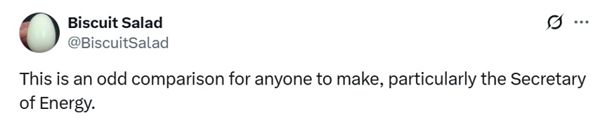 還有網友說,「對任何人來說,作出這樣的比較都很奇怪,尤其是對能源部長來說。」 ↓