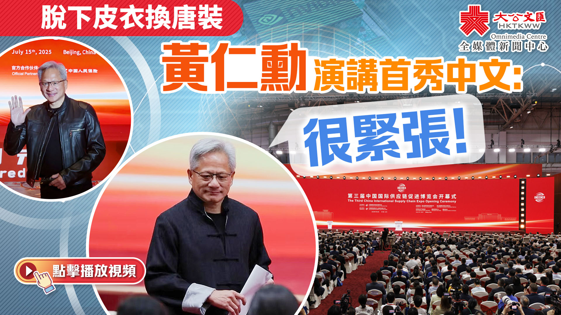 大公文匯全媒體報道,據中新網報道,7月16日,英偉達CEO黃仁勳一身唐裝亮相在第三屆鏈博會開幕式,引發關注。在開幕會致辭環節,他還選擇用中文演講了一小段。他表示,這是他第一次用中文演講,感覺很緊張。