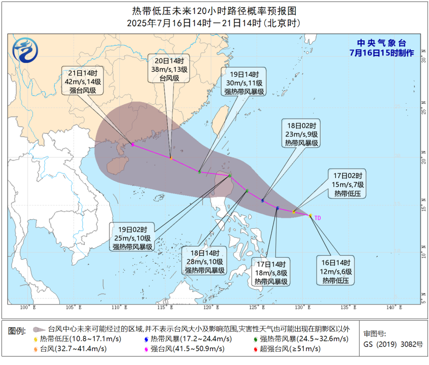 中央氣象台指,今日下午2時,該熱帶低壓距離菲律賓馬尼拉偏東方向約1060公里(北緯13.9度、東經130.8度),最大風力6級,中心氣壓1002hPa,將以每小時15~20公里的速度向西偏北方向移動,強度逐漸增強。根據中央氣象台未來120小時路徑概率預報圖,該熱帶低壓將於明日(17日)增強為熱帶風暴級,並於本周五(19日)橫過菲律賓呂宋一帶,之後繼續向西北方向移動,於下周一(21日)以強颱風級之姿直撲珠江口一帶。