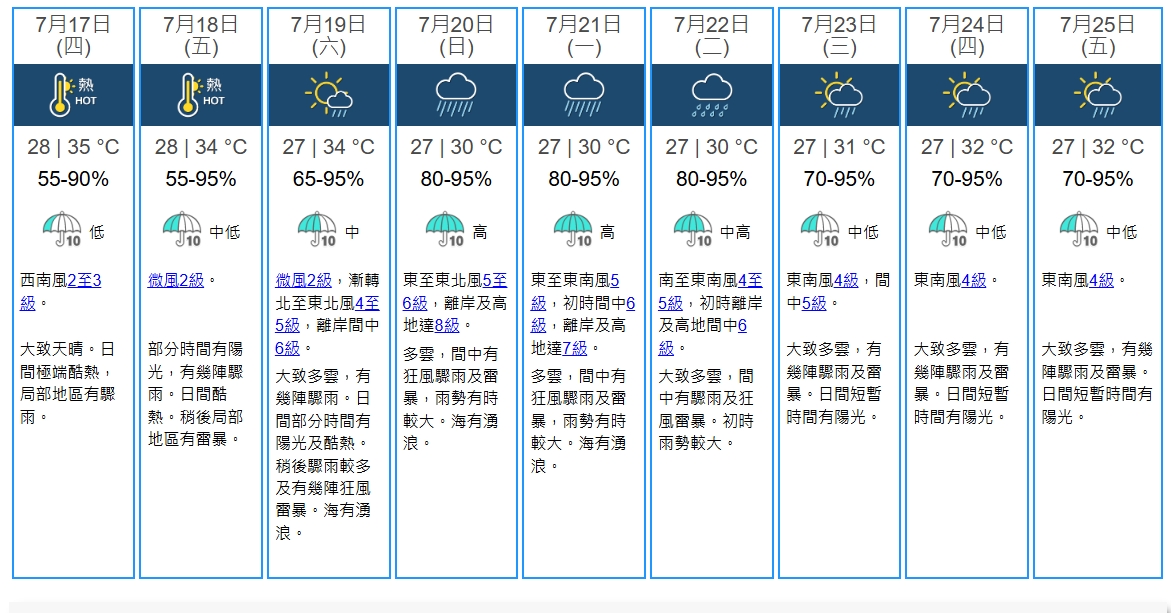 香港天文台表示,該熱帶氣旋會在周末至下周初為廣東沿岸及南海北部帶來狂風驟雨及雷暴,海有湧浪。根據九天天氣預報,20日(周日)及21日(周一)顯著降雨概率均為高,多雲,間中有狂風驟雨及雷暴,雨勢有時較大。