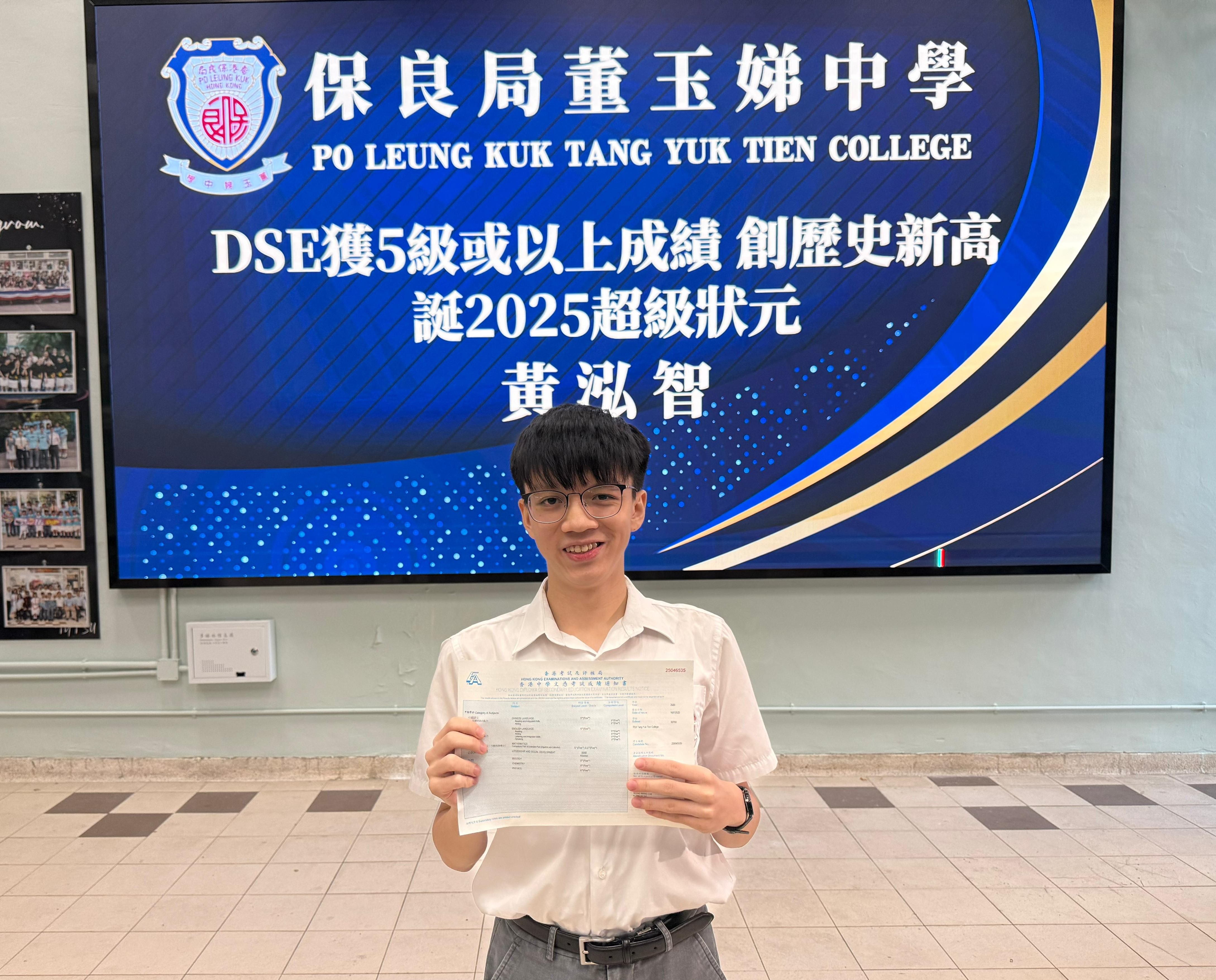 屯門區保良局董玉娣中學「超級狀元」黃泓智在中英數、物理、化學、生物,以及數學延伸部分取得5**。他心水香港中文大學醫學院,坦言基層群體資源不是特別豐富,學歷不太高,健康很重要,希望透過自己的能力去幫助他人,將來可以在公院工作。