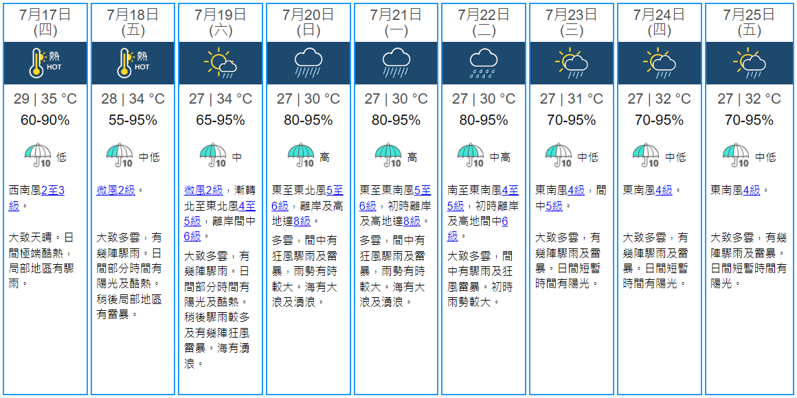 天文台預測本港地區今晚及明日天氣大致天晴,明早最低氣溫約29度,日間極端酷熱,局部地區有驟雨,市區最高氣溫約35度,新界再高一兩度,吹輕微至和緩西南風。隨後一兩日高溫天氣持續,局部地區有驟雨及雷暴,而星期六稍後驟雨增多。星期日及星期一風勢頗大,離岸及高地風達8級,有狂風驟雨及雷暴,海有大浪及湧浪。