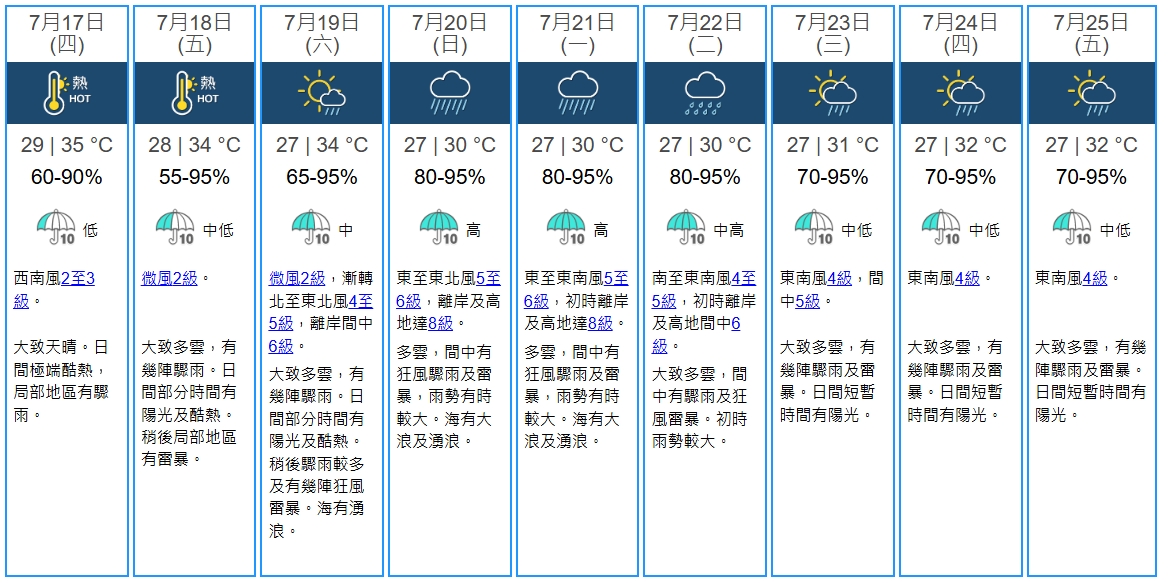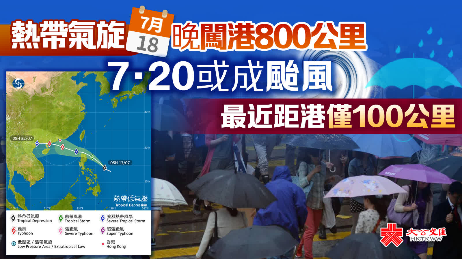 天文台預料,該熱帶氣旋將逐步增強,周五(18日)晚上以強烈熱帶風暴級進入香港東南800公里範圍,然後向西北移動,逼近珠江口,在本周日(20日)晚上以颱風級別在本港南面約100公里掠過,下周一(21日)在廣東西部陽江一帶登陸,與內地中央氣象台及澳門地球物氣象局「較強較西」的預測相若。