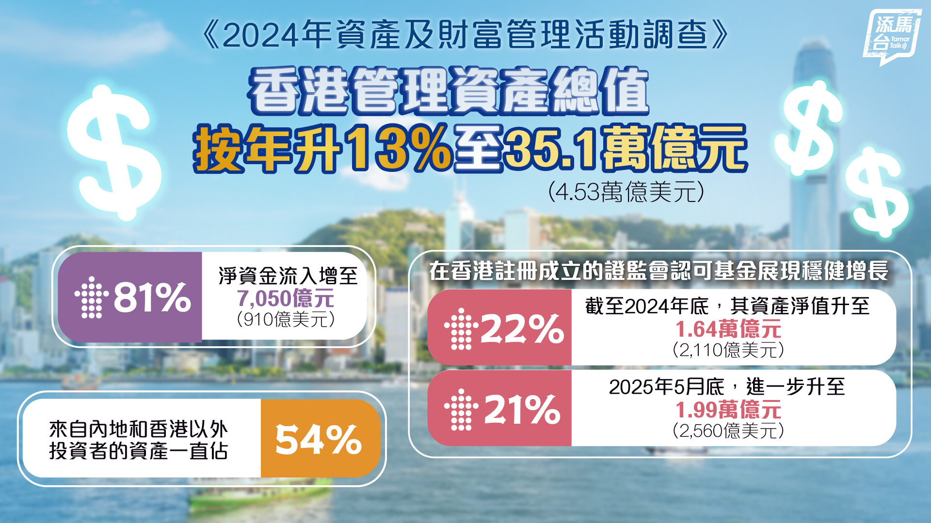 證券及期貨事務監察委員會(證監會)7月16日公布的《2024年資產及財富管理活動調查》指出,香港作為卓越的國際資產及財富管理中心正步入佳境,去年其管理資產總值按年大增13%至35.1萬億元(4.53萬億美元),淨資金流入更急升81%至7,050億元(910億美元)。