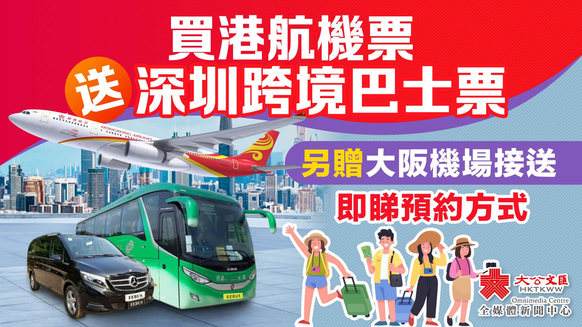 大公文匯全媒體報道,香港航空(Hong Kong Airlines)今日(17日)公布,分別與「永東巴士」及日本阿拉丁集團達成合作,推出免費機場接送服務。由即日起至12月31日,香港航空航班乘客可於指定櫃枱枱免費兌換一張香港機場至深圳或深圳至香港機場的單程跨境車票;而預訂香港航空大阪航班的乘客,則可免費預約一次接送車服務,輕鬆抵達下榻酒店或返回機場。