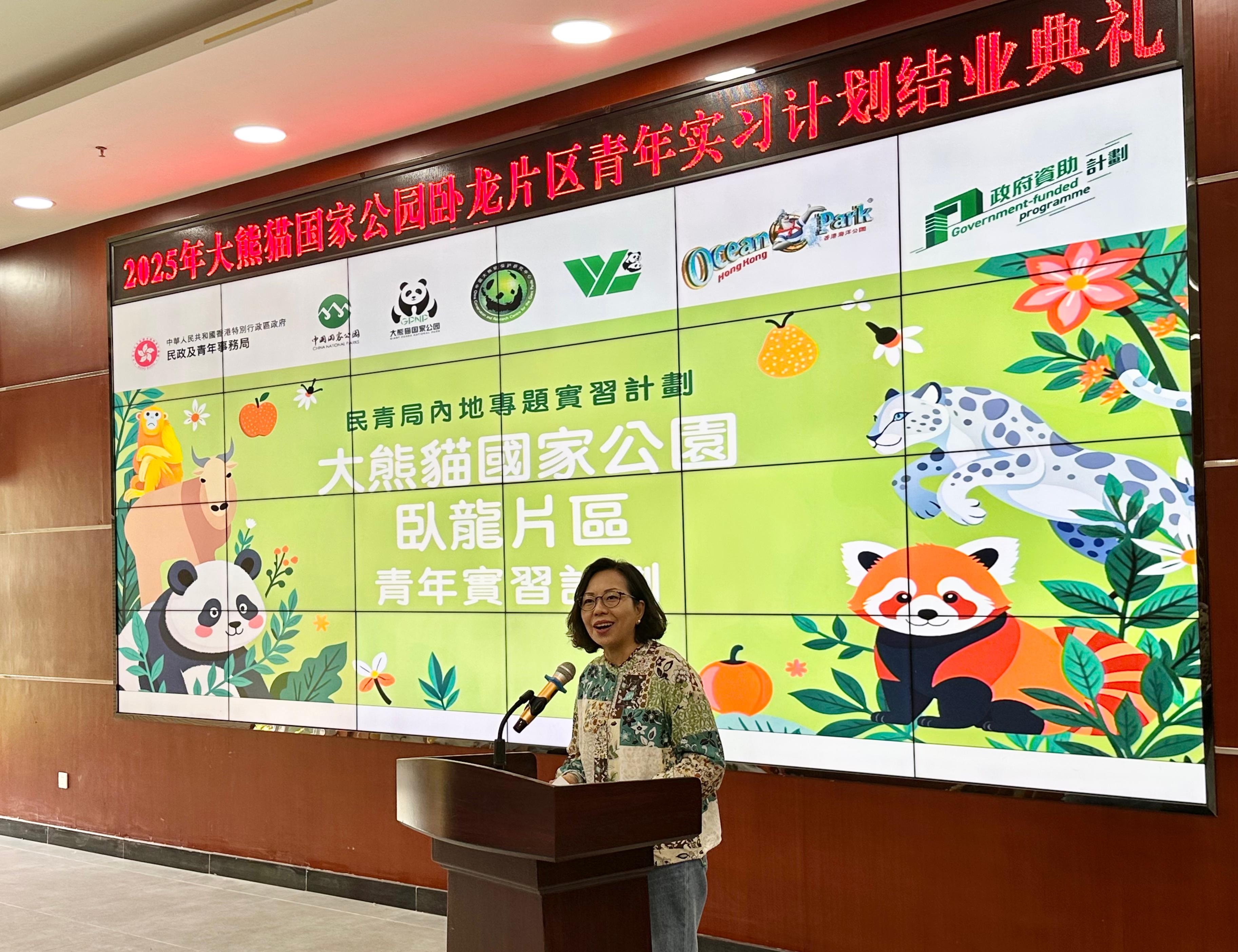 下午,麥美娟出席「大熊貓國家公園臥龍片區青年實習計劃2025」結業禮,見證20位香港青年順利完成實習旅程。麥美娟致辭時表示民青局自2017年起便與四川臥龍國家級自然保護區管理局(臥龍管理局)和中國大熊貓保護研究中心共同舉辦實習計劃,為香港青年提供自然保育和生態旅遊方面的專業培訓及實際工作經驗。她十分感謝四川省林業和草原局、臥龍管理局及中國大熊貓保護研究中心多年來對香港青年發展工作的支持,讓同學可以從實習工作中累積實踐經驗。