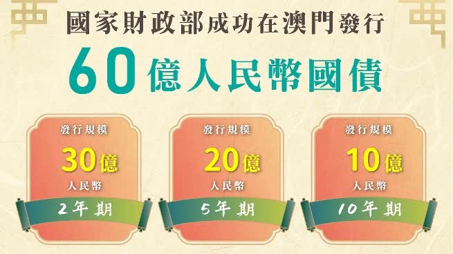 (大公文匯網記者 鍾佩欣)據澳門新聞局消息,國家財政部昨(17)日成功在澳門特區發行人民幣國債,澳門金融管理局對國債的成功發行表示祝賀,並感謝國家財政部對澳門發展債券市場的長期支持。是次國債面向專業投資者發行,發行規模為60億人民幣。其中,2年期國債發行金額為30億人民幣,發行利率定價為1.43%;5年期國債發行金額為20億人民幣,發行利率定價為1.55%;10年期國債發行金額為10億人民幣,發行利率定價為1.72%。本次國債發行受到市場歡迎,獲得超額認購。