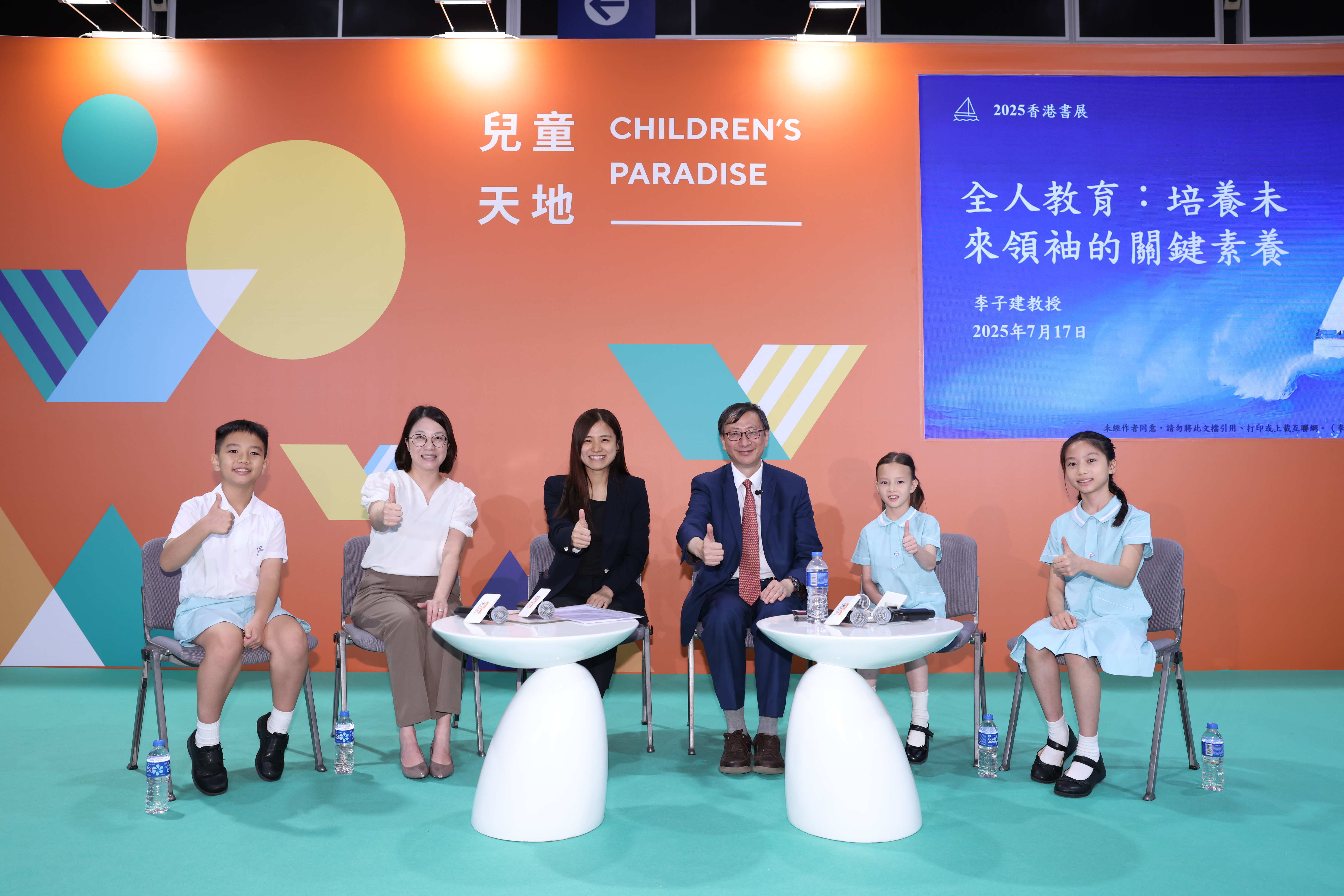 此外,李教授亦於書展「兒童天地」舞台上,與兩名小學生主持及嘉賓一同討論「全人教育:培育未來領袖的關鍵素養」。在這場跨世代的教育對話中,他們共同探討如何塑造未來領袖應具備的核心素養,包括國内「德、智、體、美、勞」的五育教育,並特別分享了中國式領袖教育的關鍵。
