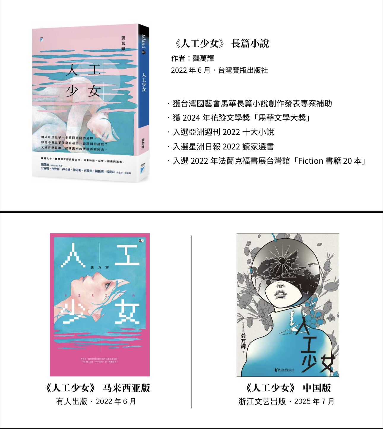 今年我負責主持的講座嘉賓,就是曾在2022年憑藉長篇小說《人工少女》獲得這一獎項的馬來西亞華文作家——龔萬輝。《人工少女》是龔萬輝第一部長篇小說,先前他曾憑短篇小說、散文,以及插畫獲獎,是的,他是美術系專業出身。龔萬輝的文筆和他畫作中的線條一樣,注重審美。