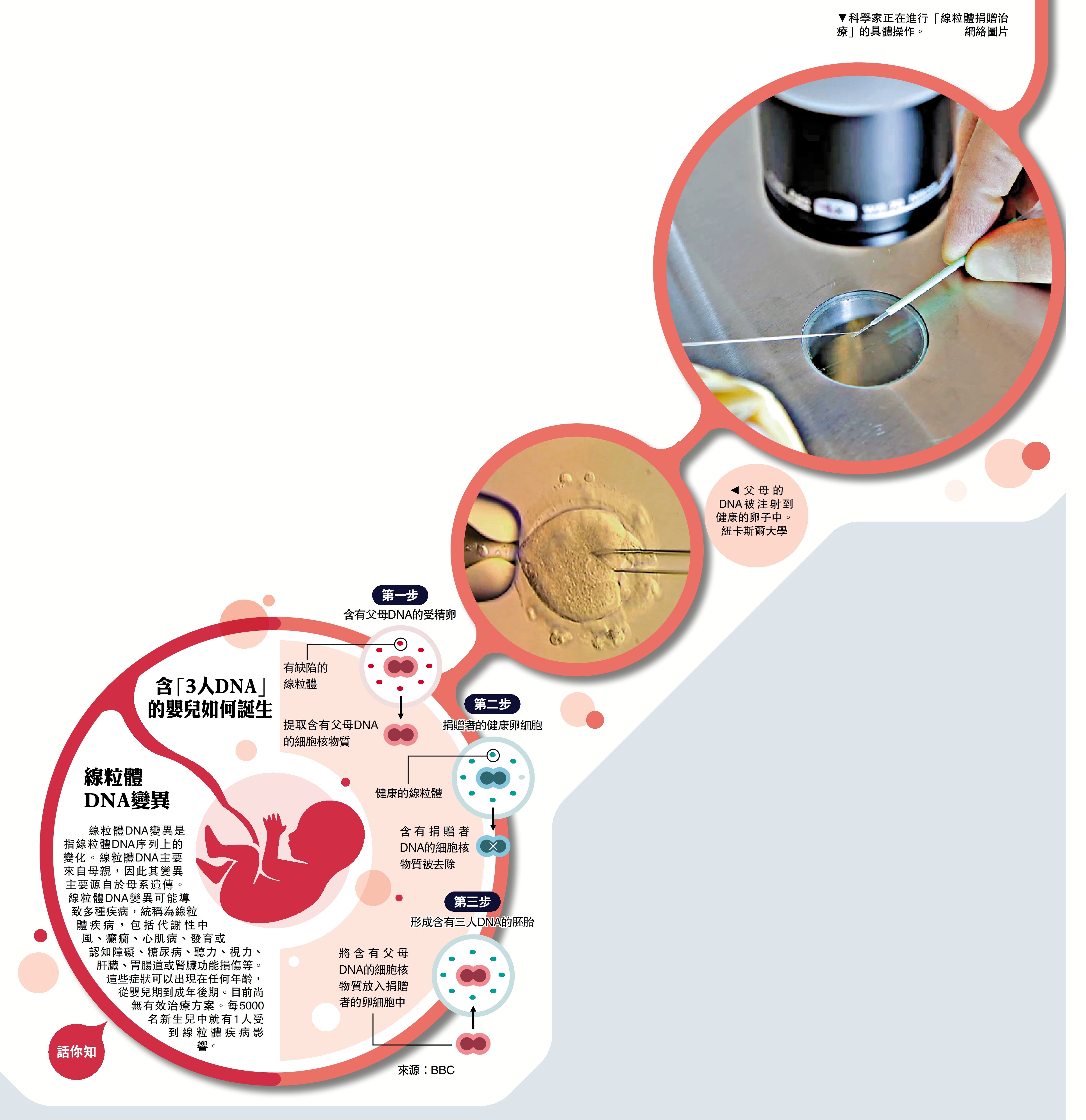 這種MDT技術主要是使用來自健康女性捐贈者卵子與嬰兒父母的DNA結合,一起形成胚胎,從而「過濾」掉母親的線粒體基因疾病。因為體內含有三個人的DNA,這些嬰兒也被稱為「三親嬰兒」(three-parent babies)。