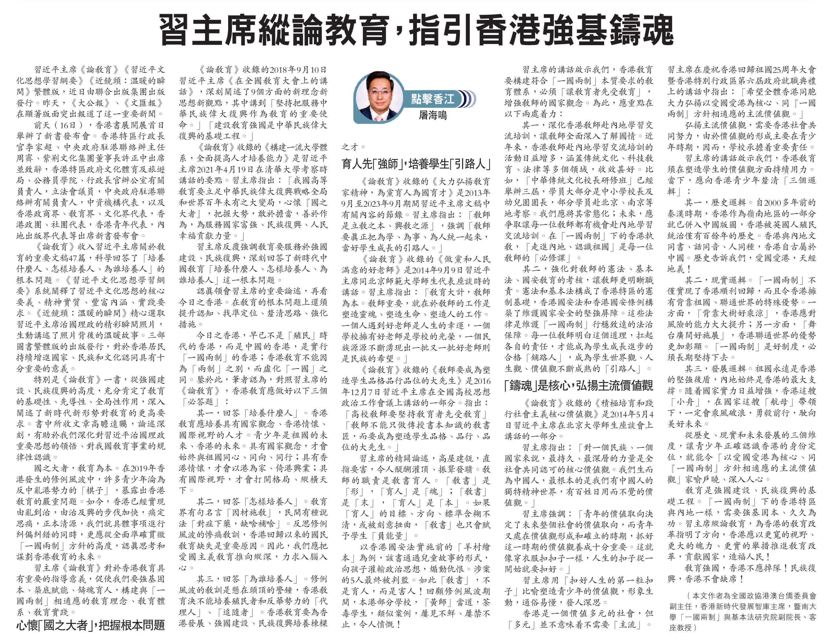 習主席《論教育》對於香港教育具有重要的指導意義,促使我們要強基固本、築底賦能、鑄魂育人,構建與「一國兩制」相適應的教育理念、教育體系、教育實踐。