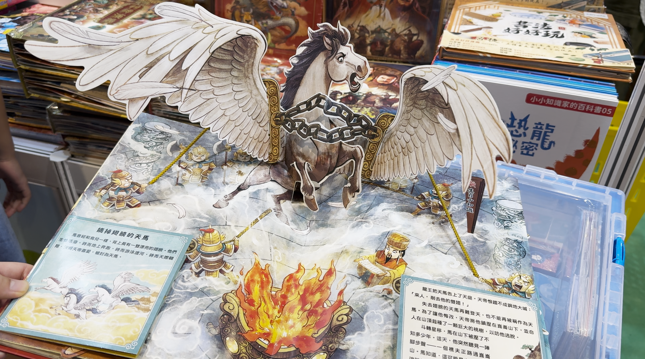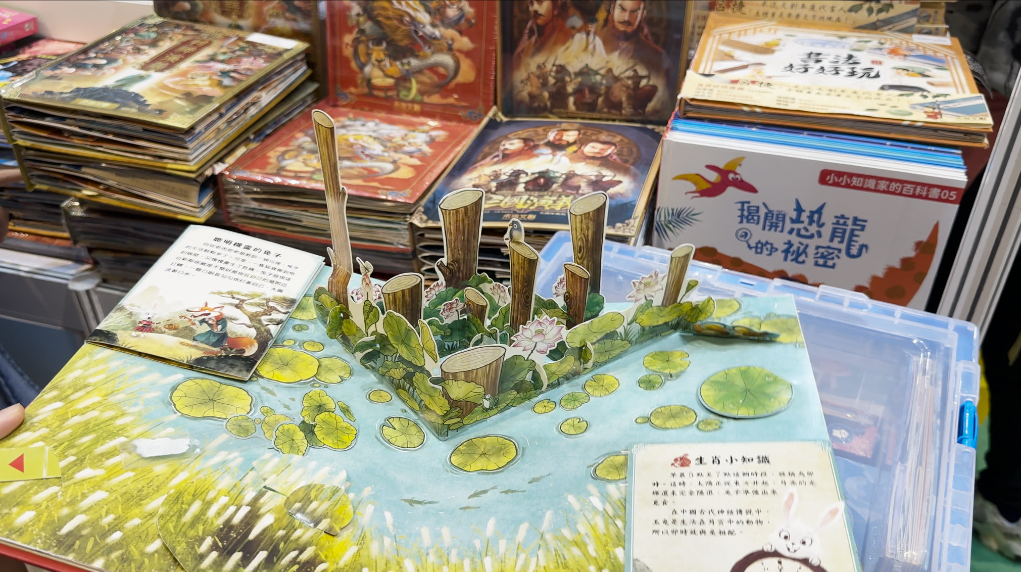 現場的童書展區,有書商推出立體書,隨着書頁的翻動,能夠在書本中呈現出栩栩如生的人物和立體逼真的建築物,吸引許多家長與學生前來購買。