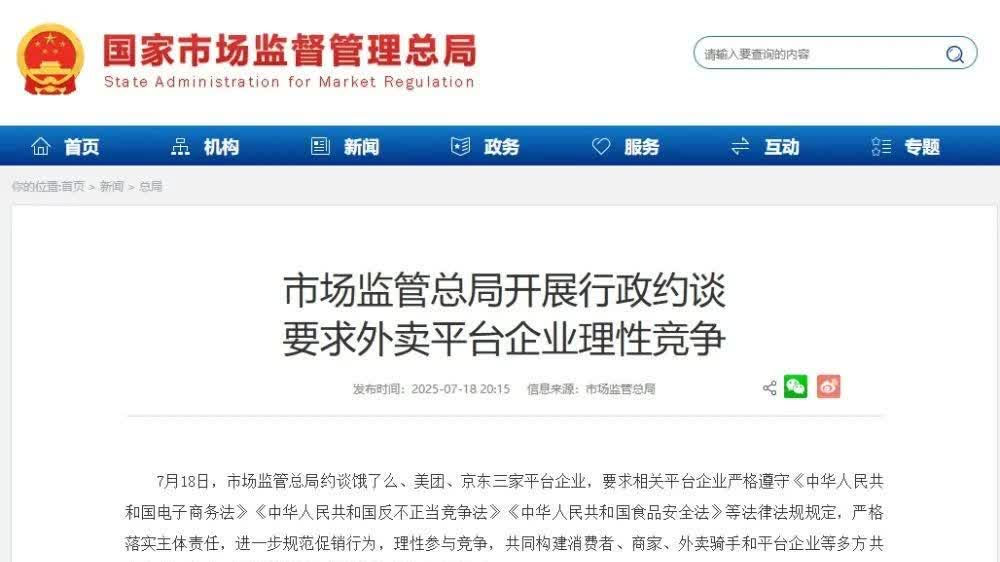據新華社報道,7月18日,市場監管總局約談餓了麽、美團、京東三家平台企業,要求相關平台企業嚴格遵守《中華人民共和國電子商務法》《中華人民共和國反不正當競爭法》《中華人民共和國食品安全法》等法律法規規定,嚴格落實主體責任,進一步規範促銷行為,理性參與競爭,共同構建消費者、商家、外賣騎手和平台企業等多方共贏的良好生態,促進餐飲服務行業規範健康持續發展。