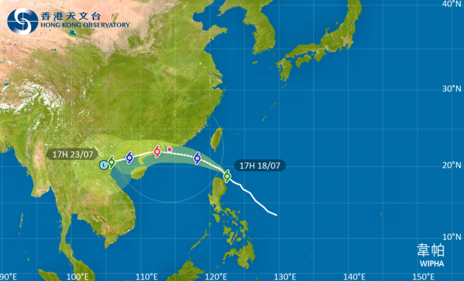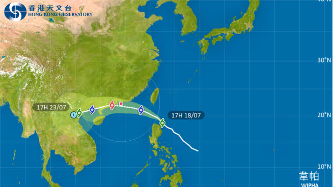 大公文匯全媒體報道,天文台今日(18日)表示按現時預測,「韋帕」會在午夜前後進入本港800公里範圍,天文台會在明日(19日)凌晨時分發出一號戒備信號。預料「韋帕」會在星期六及星期日(20日)逐步增強並靠近珠江口一帶,本港星期六稍後風勢逐漸增強,雨勢頗大及有狂風雷暴。天文台會考慮在星期六的日間發出三號強風信號。