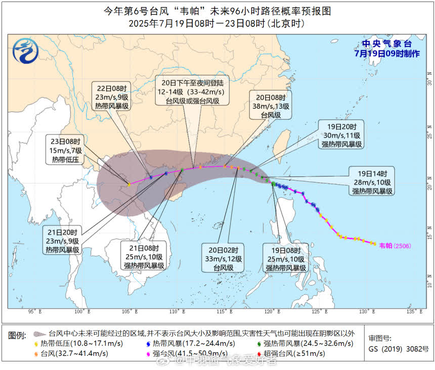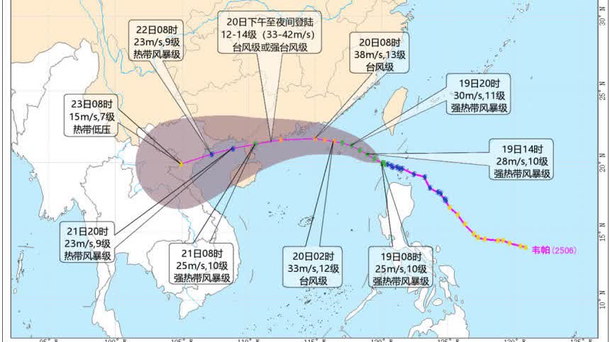 據央視新聞報道,深圳市氣象台7月19日11時55分發布消息,今年第6號颱風「韋帕」(強熱帶風暴級)已進入南海。預計「韋帕」將以20至25公里的時速向西偏北方向移動,趨向廣東中西部沿海,強度逐漸加強到颱風級或強颱風級,有可能在珠三角沿岸近距離擦過或珠江口附近登陸,20日白天距深圳最近120公里以內。