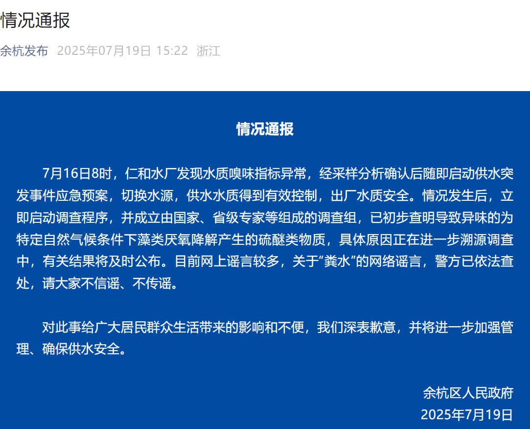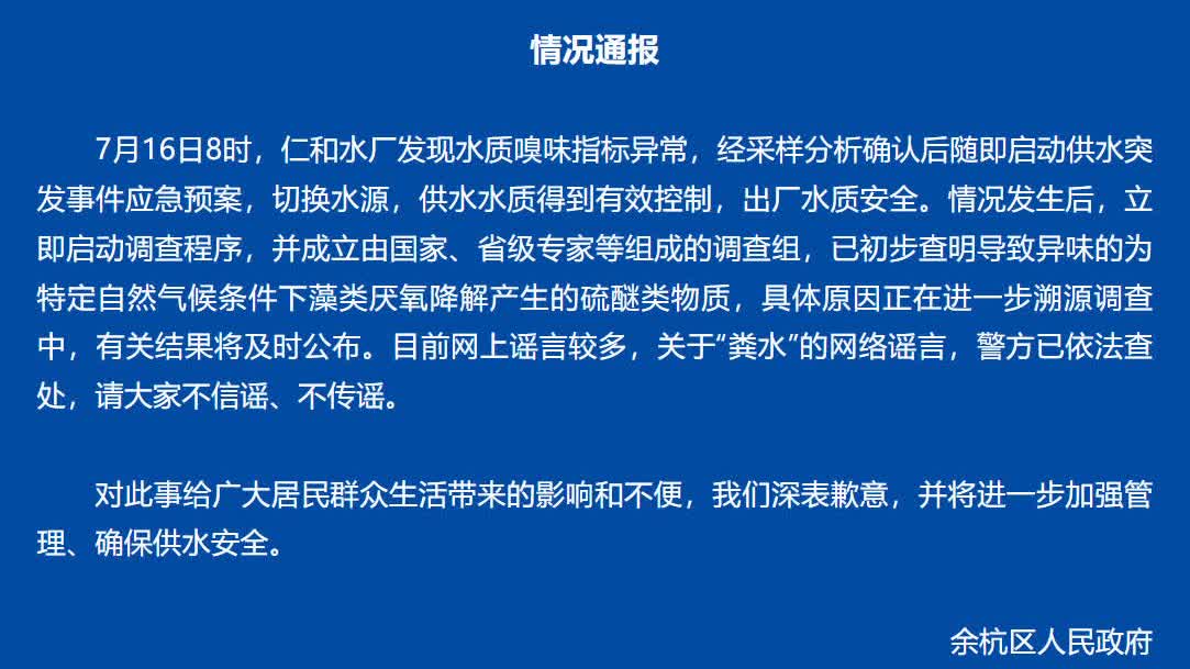 通報稱,7月16日8時,仁和水廠發現水質嗅味指標異常,經採樣分析確認後隨即啟動供水突發事件應急預案,切換水源,供水水質得到有效控制,出廠水質安全。情況發生後,立即啟動調查程序,並成立由國家、省級專家等組成的調查組,已初步查明導致異味的為特定自然氣候條件下藻類厭氧降解產生的硫醚類物質,具體原因正在進一步溯源調查中,有關結果將及時公布。