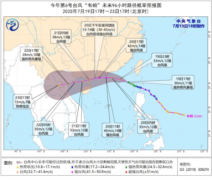中央氣象台預報,7月19日20時至20日20時,南海北部海域、廣東沿海的風力可達8~11級,陣風12~13級,颱風中心經過的附近海域風力有12~14級,陣風15~16級。海南島、廣東中南部、廣西東南部、福建東部、浙江南部、江西西南部、湖南南部、台灣島大部等地有大到暴雨,其中,廣東西南部、海南島北部、台灣島東部等地的部分地區有大暴雨,廣東西南部沿海、海南島東北部等地局地有特大暴雨(250~280毫米)。上述部分地區伴有短時強降水(最大小時降雨量20~50毫米,局地可超過80毫米),局地有雷暴大風等強對流天氣。