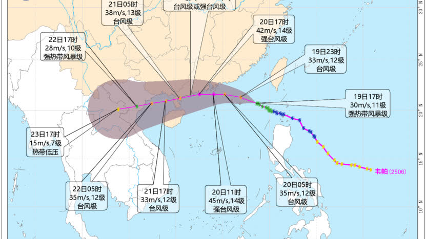 中央氣象台預計,「韋帕」將以每小時30公里左右的速度向西偏北方向快速移動,強度繼續加強,向廣東珠海到海南文昌一帶沿海靠近,並將於20日下午至夜間在上述沿海登陸(13~14級,38~45米/秒,颱風級或強颱風級),以後穿過廣東雷州半島,21日白天移入北部灣海面,隨後趨向越南北部沿海。