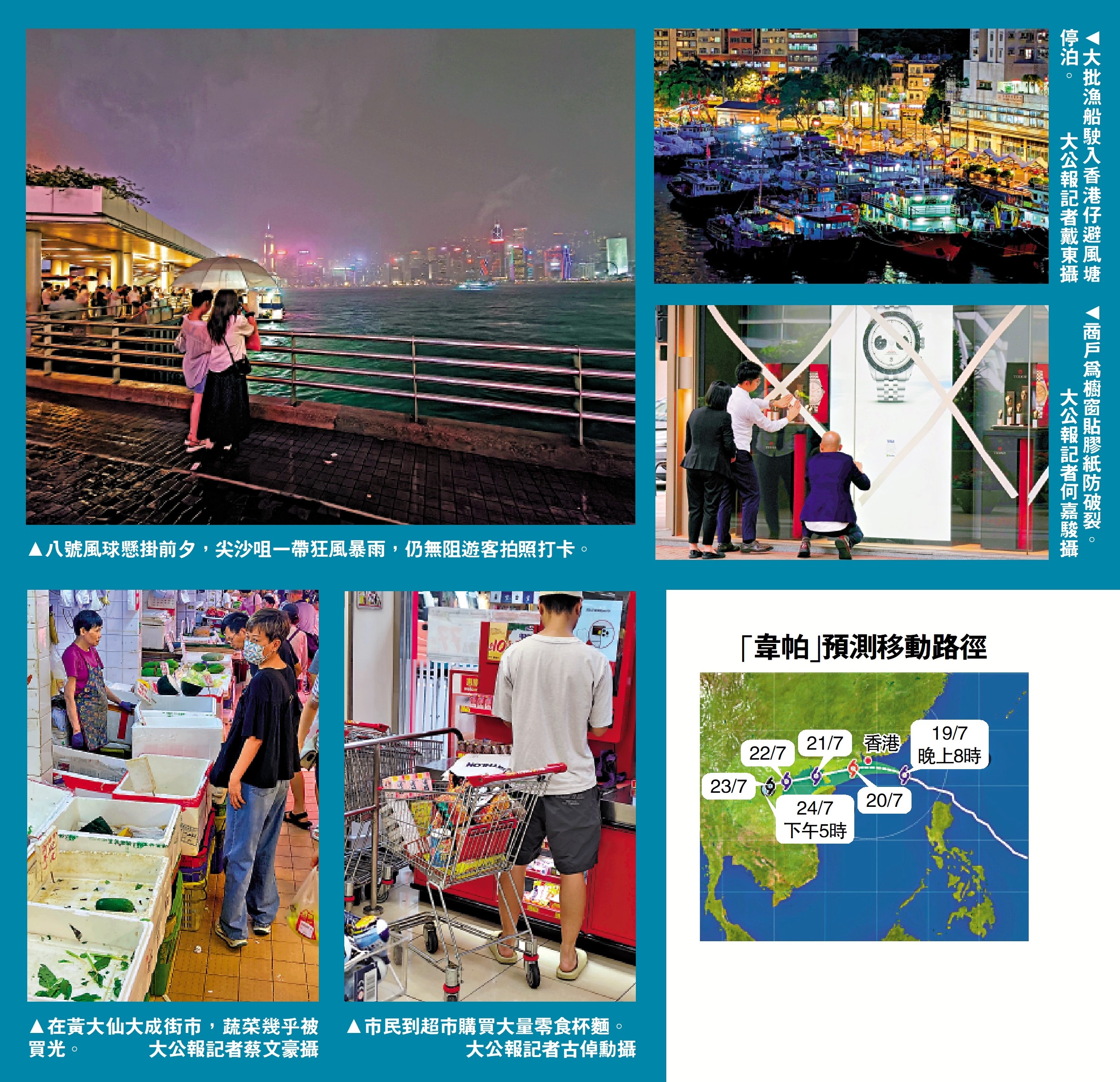 (大公報 記者 伍軒沛)風暴「韋帕」直撲香港,全城戒備。天文台於今日凌晨0時20分改發八號信號,是本港今年首個八號風球。「韋帕」的中心附近最高持續風速昨晚達到每小時110公里,天文台預測今日將增至130公里,料「韋帕」將會橫過南海北部並移近廣東沿岸,近距離掠過香港以南海域,天氣轉為有頻密狂風大驟雨及雷暴。天文台表示,八號信號今日日間大部分時間維持,並將評估今早是否需改掛更高風球,政府多個部門嚴陣以待。