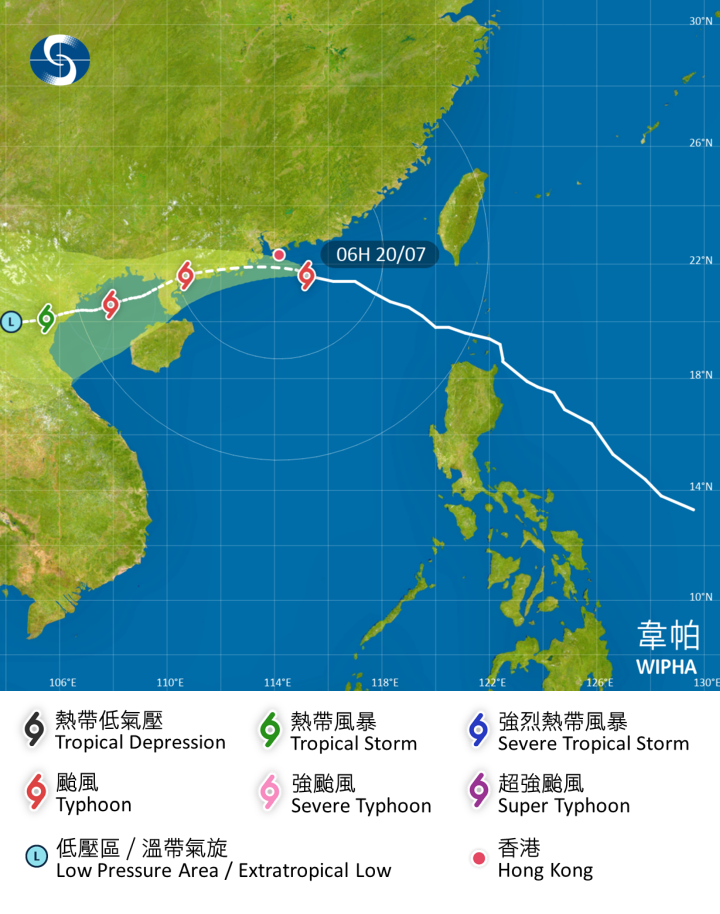 隨着「韋帕」進一步靠近,預料本港今日日間天氣持續惡劣,有狂風大驟雨,海有巨浪及湧浪,市民應遠離岸邊及停止水上活動。受風暴潮影響,預料部分沿岸低窪地區可能出現水浸,而大埔滘的水位今早曾上升至海圖基準面以上3米左右。