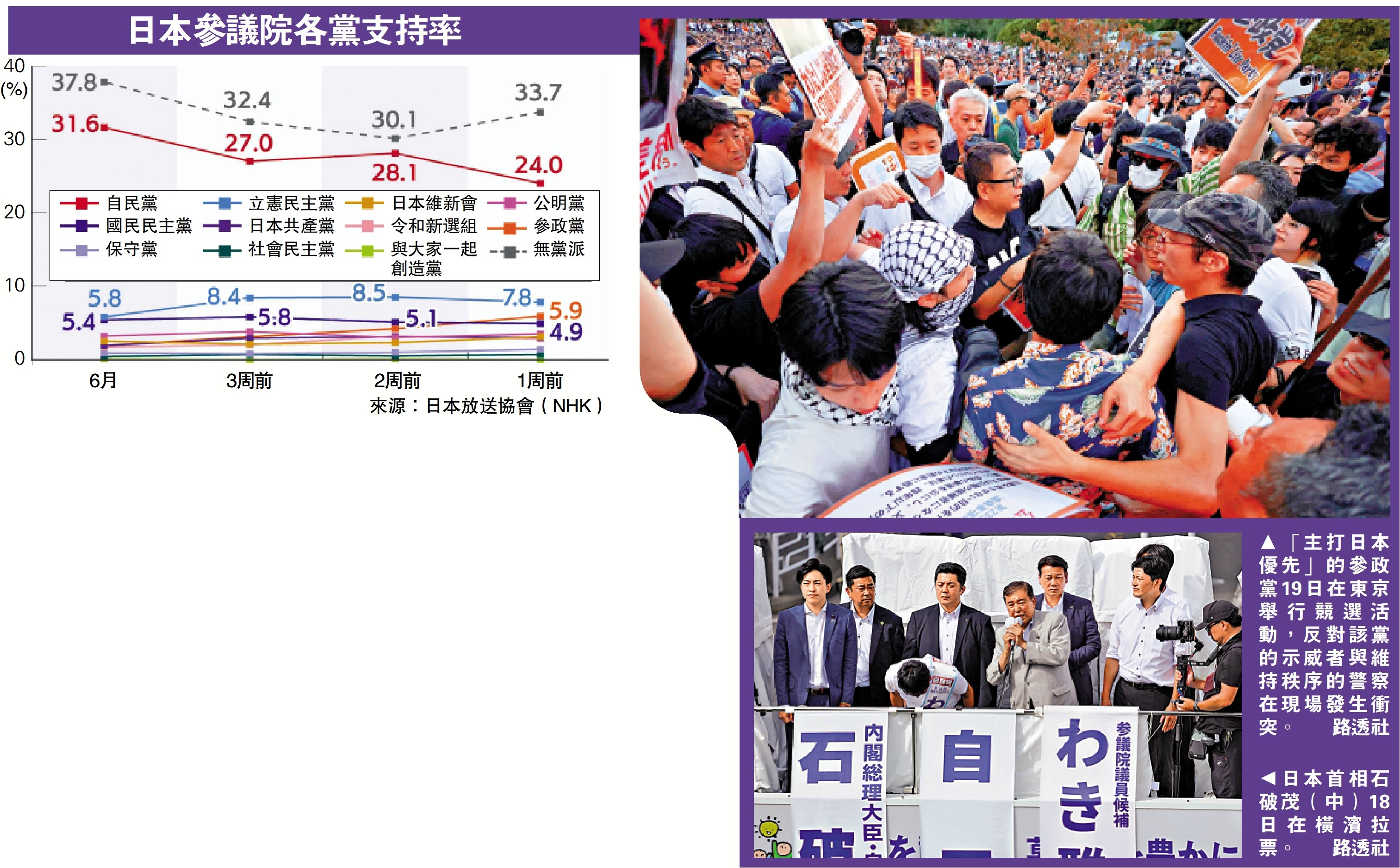 (大公報訊)日本周日舉行參議院選舉。最新民調顯示,執政黨自民黨和公明黨組成的執政聯盟選情不佳,有可能失去參議院多數黨。目前,自民黨支持率已跌至24%,首相石破茂領導的內閣支持率更降至20.8%。選民普遍關注物價上漲、關稅問題和外國人政策等議題,而自民黨應對不力惹選民不滿。由於執政聯盟去年在眾議院失去多數黨地位,若在此次參議院選舉中失利,石破茂辭職下台的壓力大增,並將加劇日本政局的不穩定。