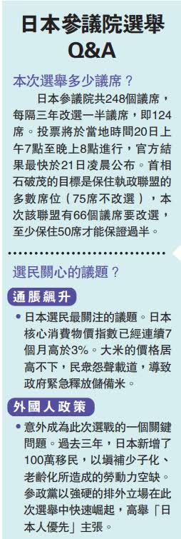 執政聯盟在去年10月眾議院選舉中已失去過半優勢,成為少數執政黨。若在參議院失利,將是自民黨15年來首次失去國會兩院多數席位,日本首相、自民黨總裁石破茂將被迫引咎辭職。
