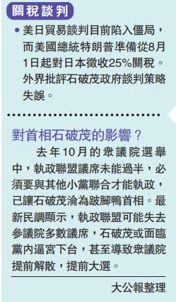 石破茂在美國關稅問題上也應對不力。此次競選期間,恰逢美國總統特朗普加大對日施壓力度,宣布擬於8月1日起對日本輸美商品加徵25%關稅。日本此前數月已與美國就關稅措施進行7輪談判,卻依舊陷入僵局,無顯著進展。