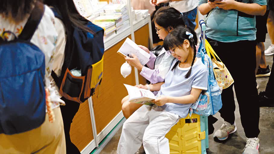 正值暑假,不少家長與子女到場,其中羅太特意帶同今年準備升小學五年級的兒子拖篋入場,表示已經斥資千多元購買練習書及課外書,給兒子在空閒時閱讀,「睇吓有乜就買乜。」由於擔心今日改發八號風球,她昨日決定提早到書展參觀,而現場人流頗多,排隊入場需時約20分鐘,但指書價較市面便宜,故希望趁打風前多購些書籍。