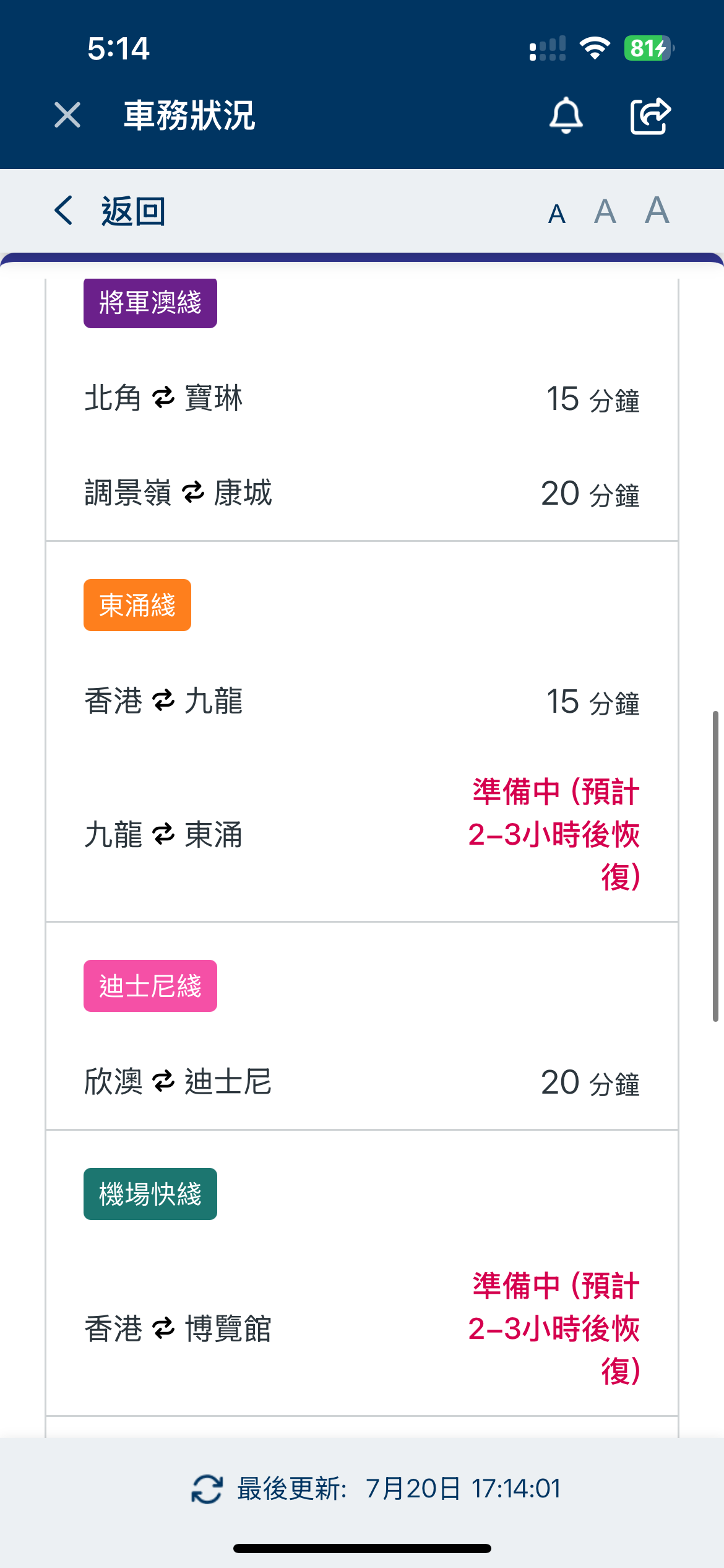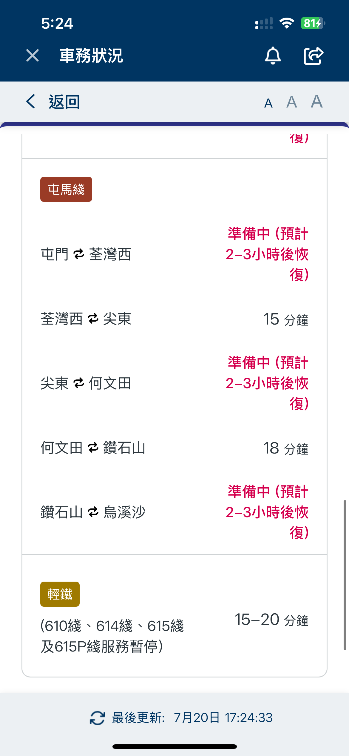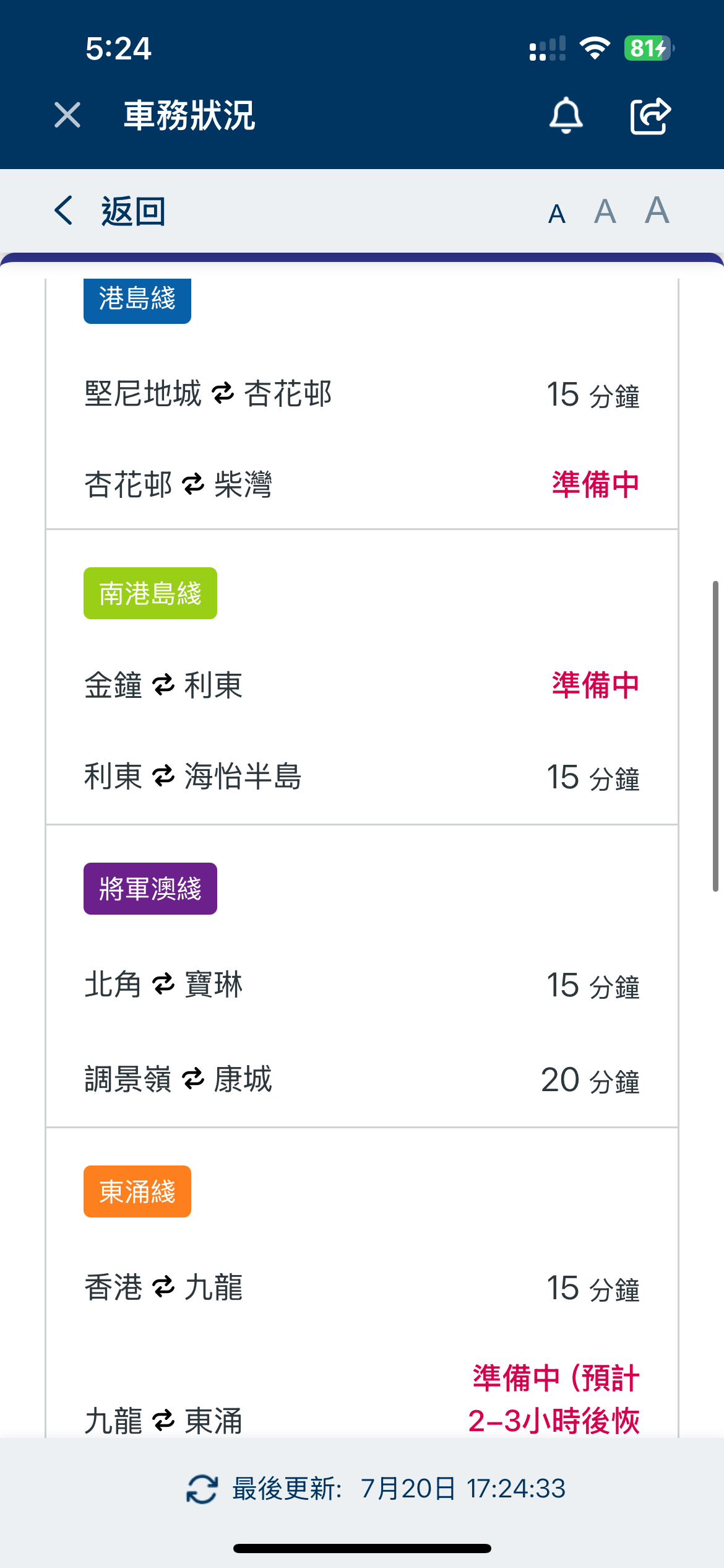 現時,荃灣綫中環至荔景站、觀塘綫黃埔至彩虹站、港島綫堅尼地城至杏花邨站、南港島綫利東至海怡半島站、將軍澳綫北角至寶琳站、東涌綫香港至九龍站、東鐵綫金鐘至紅磡站,屯馬綫尖東至荃灣西站,以及輕鐵維持15分鐘一班車。