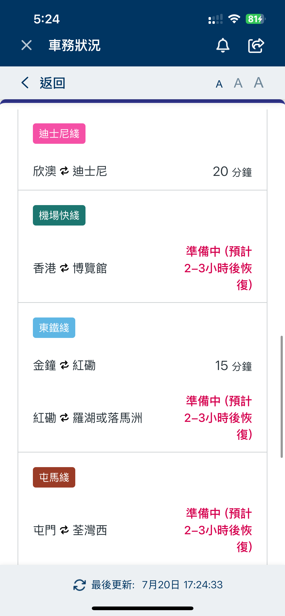 屯馬綫鑽石山至何文田站,每18分鐘一班。將軍澳綫調景嶺至康城站,以及迪士尼綫,維持每20分鐘一班車。