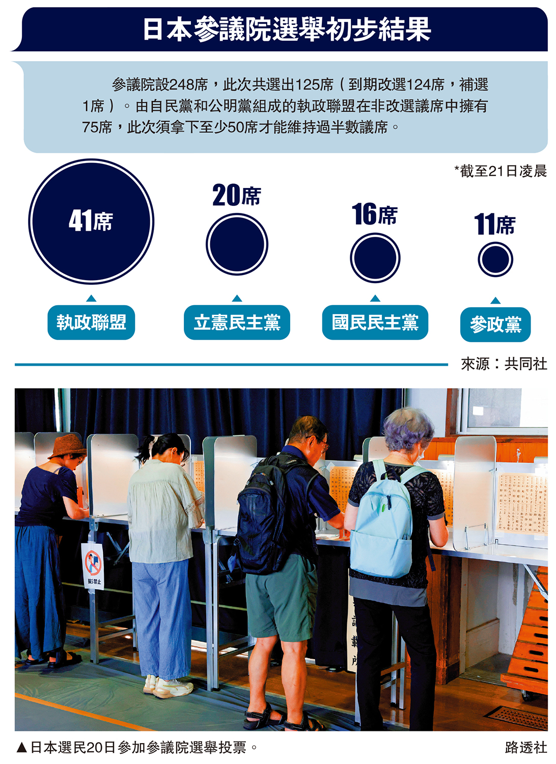 香港文匯報報道,日本第27屆參議院選舉於周日(7月20日)舉行,被視為選民對去年10月起擔任日本首相兼執政黨自民黨總裁的石破茂的施政評價。日本放送協會(NHK)及共同社等媒體的票站外調查結果顯示,自民黨和公明黨組成的執政聯盟議席數目較上屆大減,無法保住參院過半數優勢,意味在國會參眾兩院均淪為少數派。