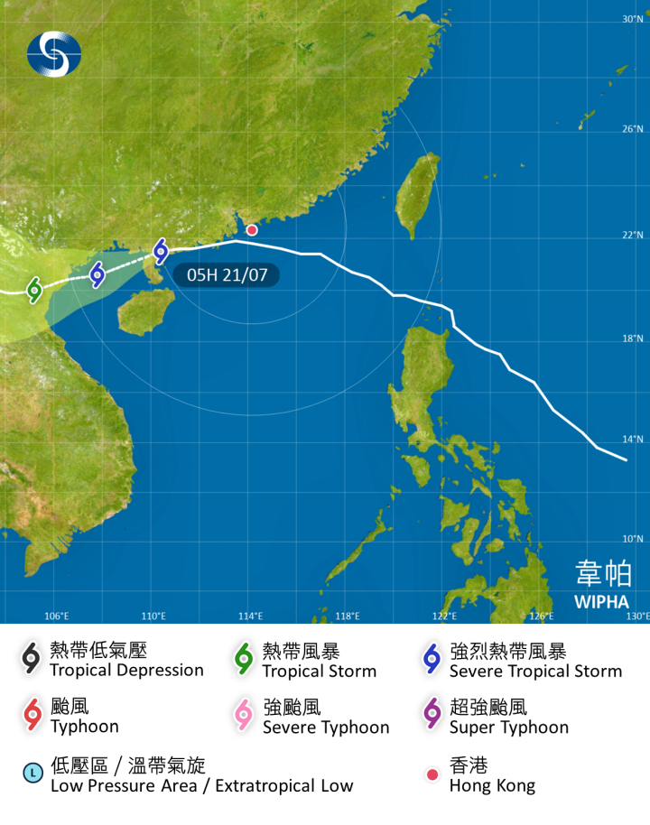 天文台預料「韋帕」的外圍雨帶今日繼續為本港帶來驟雨及狂風雷暴,雨勢有時頗大。海面仍有湧浪。市民請保持警惕,遠離岸邊並停止水上活動。